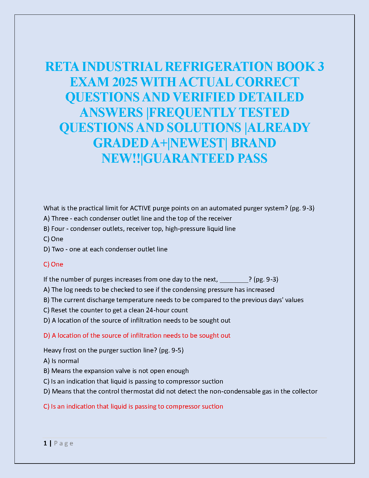 Elevate your exam preparation with the latest 2025 Test Bank for RETA's Industrial Refrigeration Book 3. This resource is meticulously crafted to ensure your success, featuring a complete collection of frequently tested questions paired with detailed, verified answers. Designed to help you master complex concepts and pass your certification exam on the first attempt, this guide provides the exact material you need to achieve an A+ grade. Stop worrying about resits and start studying with confidence. Get the brand new, updated solution manual and secure your RETA certification.