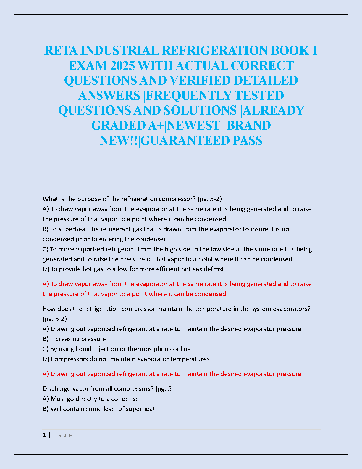 Unlock success in your RETA certification with our comprehensive test bank for Industrial Refrigeration I (Book 1). This premium study guide is packed with authentic exam questions and detailed, verified answers, covering all the essential topics from the official RETA manual. Designed to help you master the material efficiently, our test bank is your ultimate tool to pass the RETA Book 1 exam on your very first try. Avoid the stress and cost of resits by preparing with proven, A+ graded content. Get immediate access to the questions and solutions frequently tested in the actual exam and walk into your test with confidence.