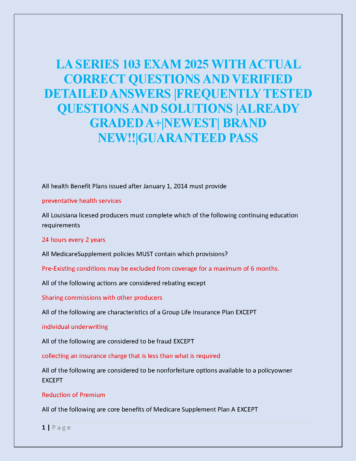 Master the Louisiana Series 103 Life, Health & Accident insurance exam with our comprehensive 2025 test bank. This essential study guide is packed with actual exam questions and meticulously verified, detailed answers to ensure you're fully prepared. Featuring frequently tested concepts and A+ graded solutions, this resource is designed to boost your confidence and help you pass on your first attempt. Topics covered include Louisiana insurance regulations, health benefit plans, Medicare supplements, and more. Don't leave your success to chance—get the ultimate preparation tool for your LA Series 103 exam!