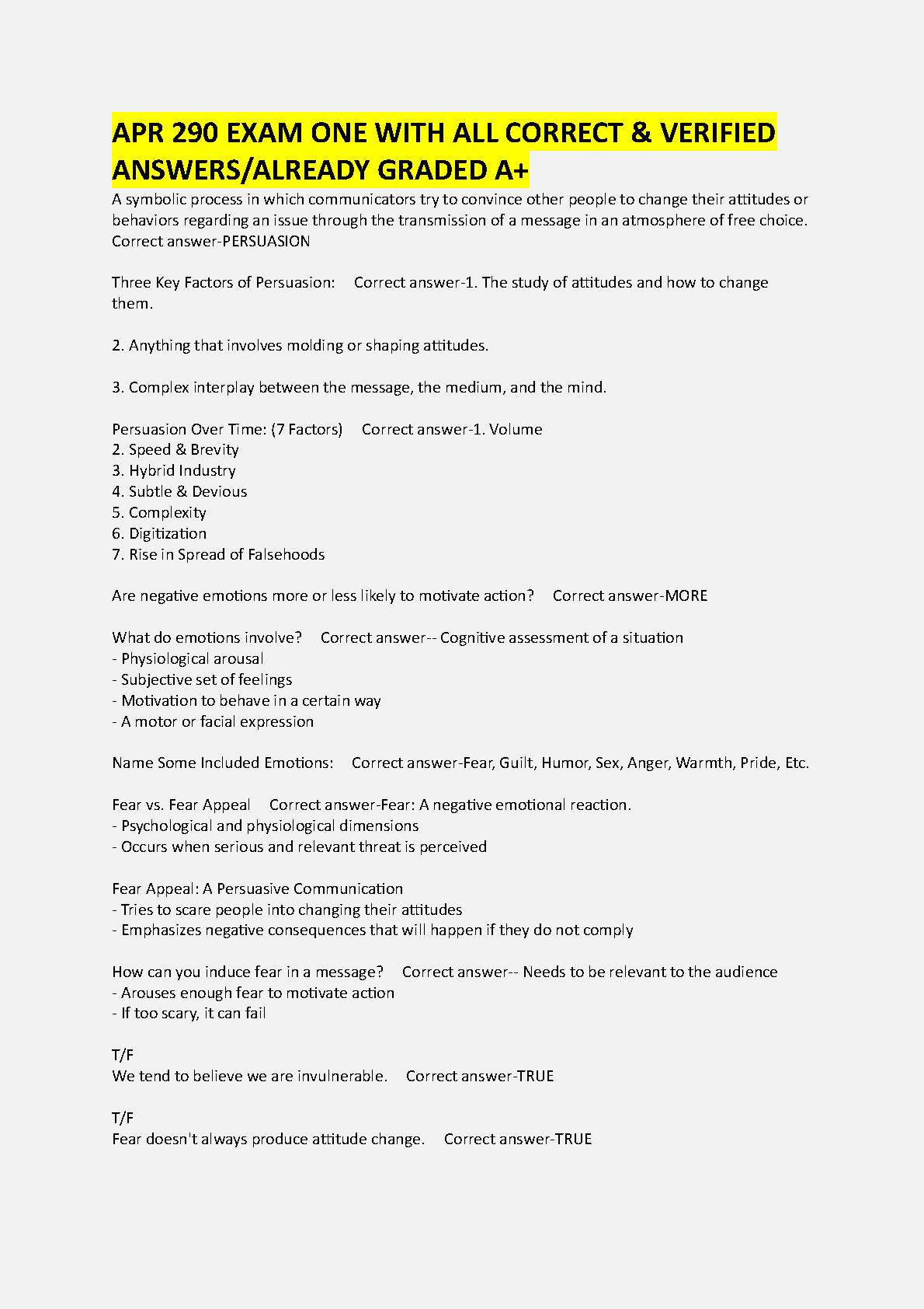 Gain an unbeatable edge in your APR 290 Persuasion course with this comprehensive test bank for Exam 1, based on 'The Dynamics of Persuasion, 8th Edition' by Richard M. Perloff. This resource provides a complete set of questions with 100% correct and verified answers, all from a paper that already achieved an A+ grade. Master key concepts such as the principles of persuasion, the role of attitudes, fear appeals, emotional triggers, and the complex interplay between message, medium, and mind. This study guide is meticulously designed to help you understand the material deeply, anticipate exam questions, and secure a top grade on your first try. Download now and start studying smarter, not harder, for your APR 290 Exam 1.