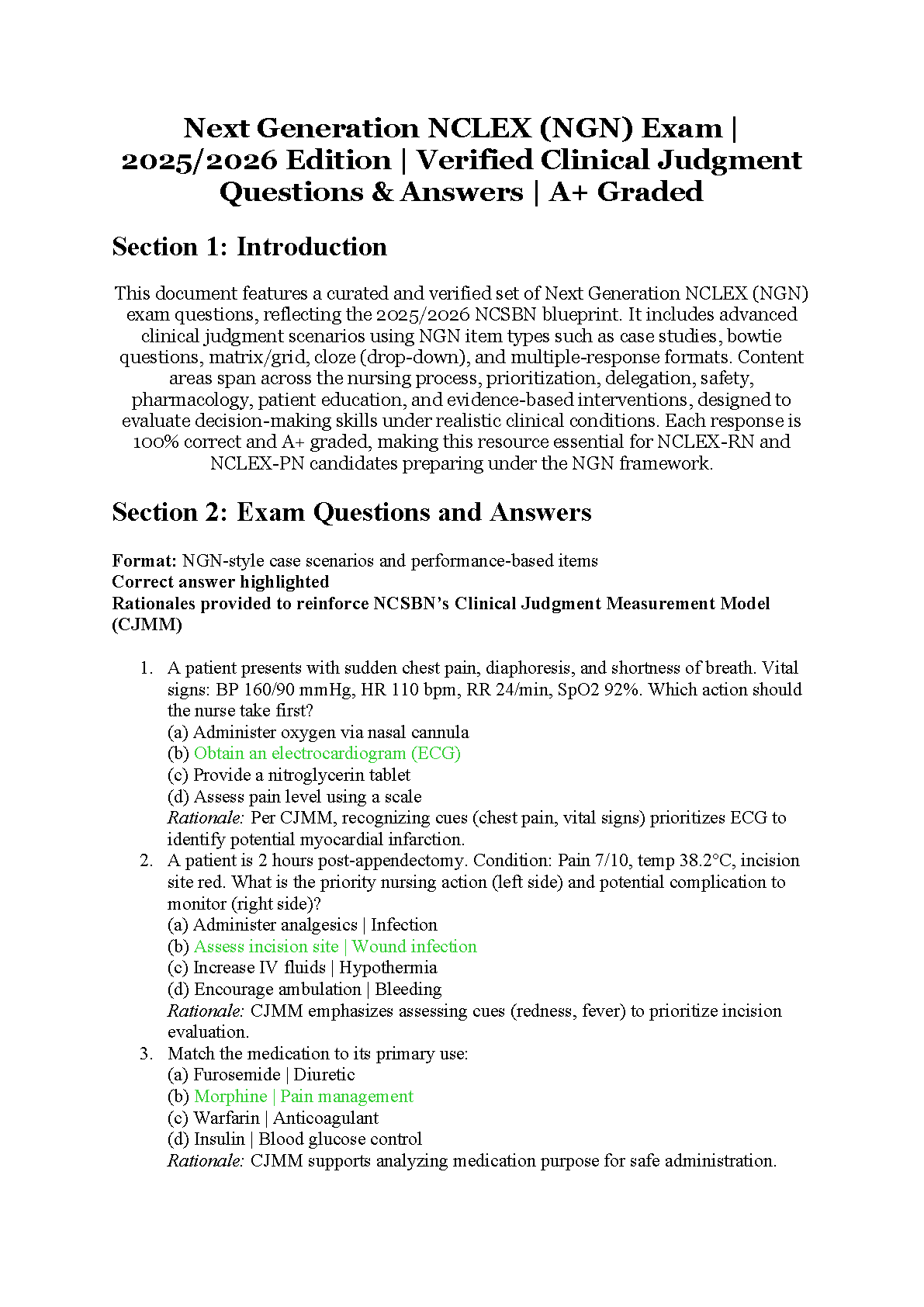 Ace your Next Generation NCLEX (NGN) exam on the first try with our definitive 2025/2026 study guide. This A+ graded resource is meticulously crafted to align with the latest NCSBN blueprint, providing a complete set of verified clinical judgment questions and detailed answers. Master complex NGN item types, including case studies, bowtie, and matrix/grid questions, covering critical areas like pharmacology, patient safety, and evidence-based practice. Our expertly explained rationales help reinforce the Clinical Judgment Measurement Model (CJMM), equipping both NCLEX-RN and NCLEX-PN candidates with the skills needed to make sound clinical decisions and pass with confidence, avoiding costly resits.