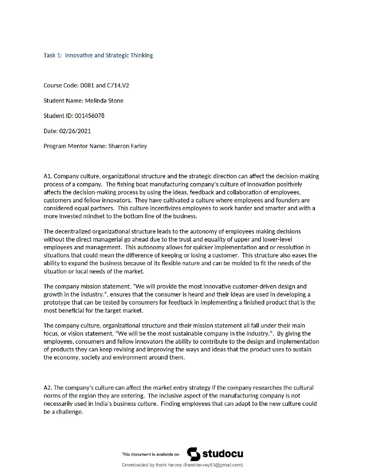 Ace your WGU Business Strategy course with this comprehensive, A-graded guide for Task 1: Innovative and Strategic Thinking. This 2025/2026 updated resource provides a detailed, top-scoring response that expertly analyzes the interplay between company culture, organizational structure, and strategic direction. It thoroughly covers all prompt requirements, including the impact on decision-making and market entry strategies. This exemplar is the perfect tool to understand the assessment's expectations, structure your own submission effectively, and ensure you pass C714 / D081 on your very first attempt. Avoid resits and accelerate your degree with this proven study aid.
