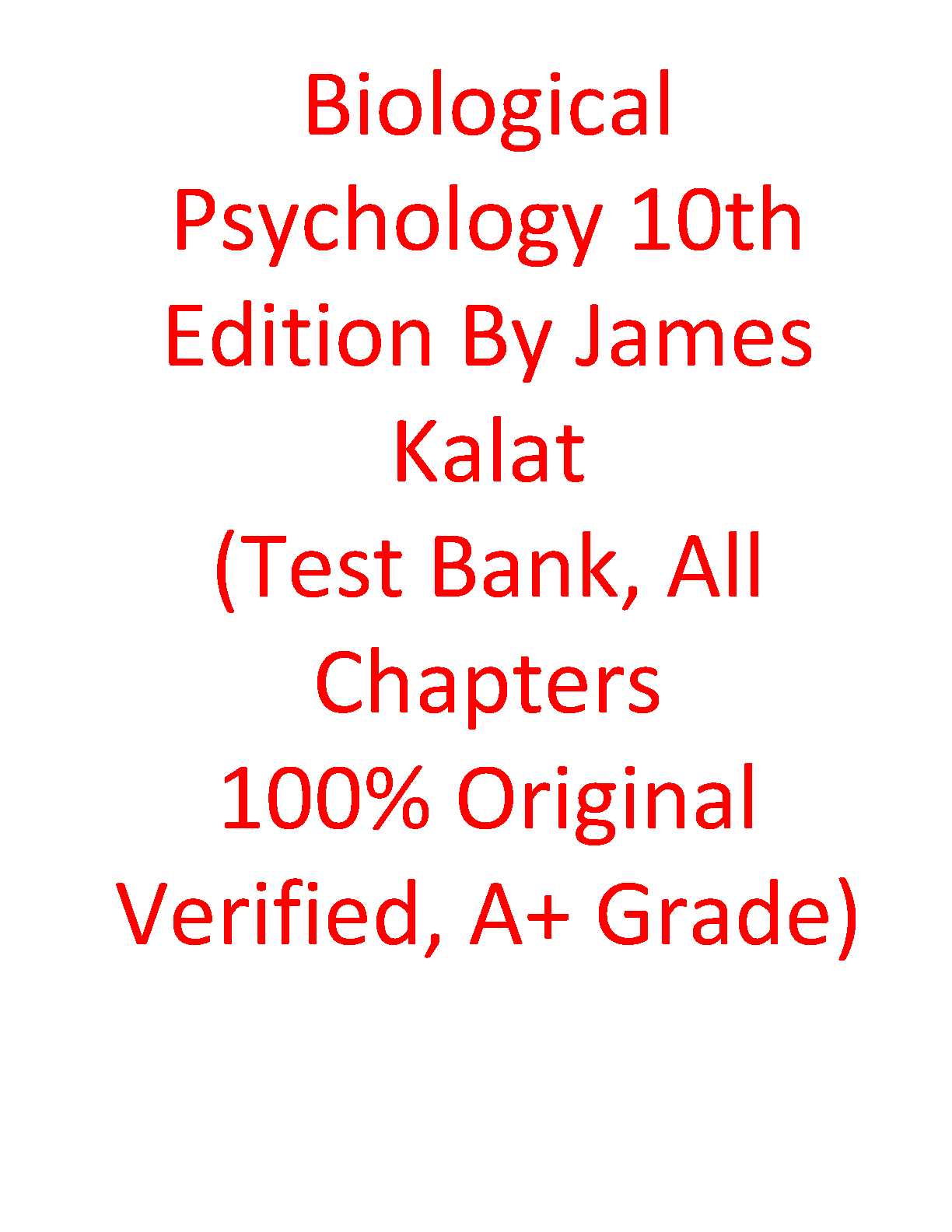 Gain a comprehensive understanding of Biological Psychology with the official Test Bank for the 10th Edition by James W. Kalat. This verified resource provides a complete collection of exam questions and answers for all chapters, designed to help you master the course material. Prepare effectively for your exams, boost your confidence, and aim for an A+ grade. It's the perfect study companion to excel in your psychology course and pass on your first attempt.