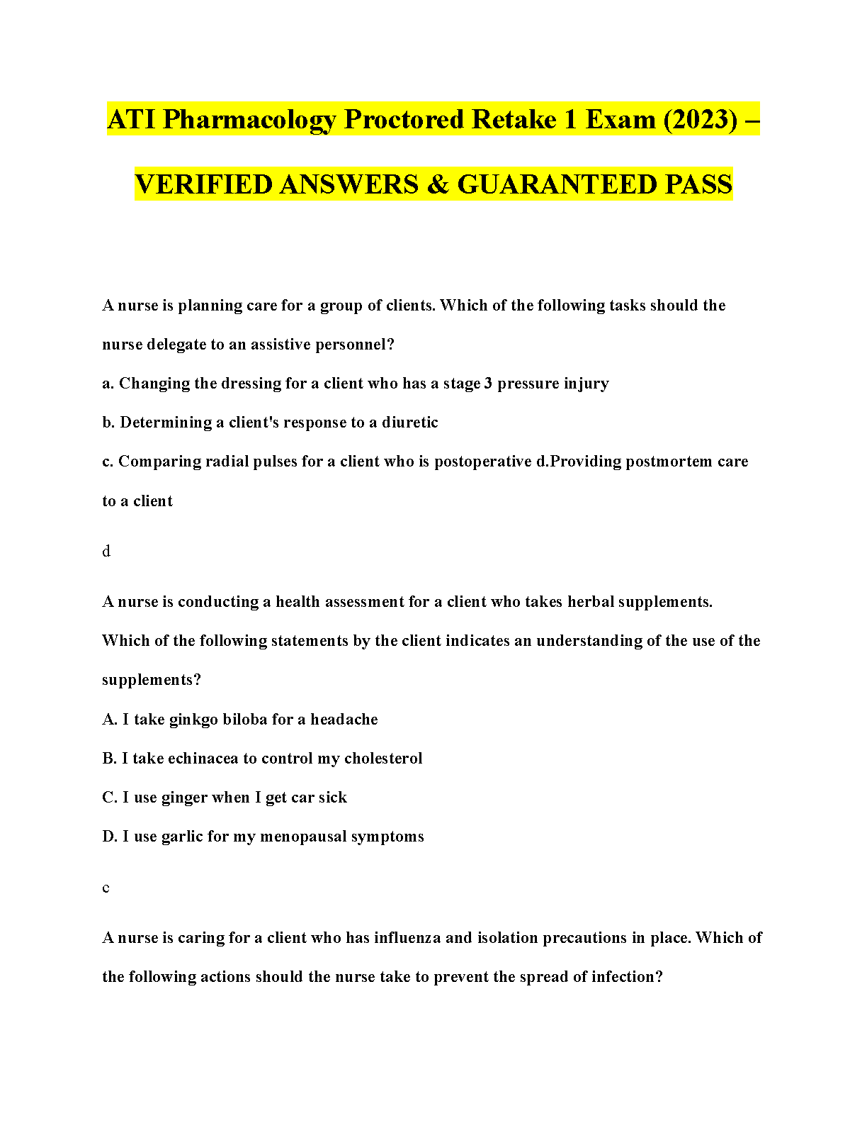 Unlock your full potential and ace the ATI Pharmacology Proctored Retake 1 Exam with our expertly compiled 2023 test bank. This comprehensive resource is packed with verified questions and detailed, accurate answers that mirror the actual proctored exam format. Designed specifically for nursing students aiming for a guaranteed pass, this study guide covers all essential topics, from drug classifications to patient safety. Stop stressing about retakes—prepare effectively, build your confidence, and achieve the high score you deserve on your very first try!
