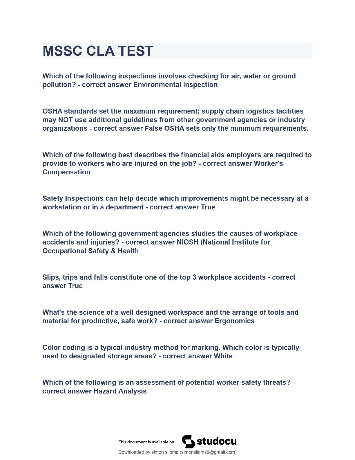 Ace your MSSC Certified Logistics Associate (CLA) exam with our comprehensive test bank. This resource provides a detailed set of questions covering essential topics such as OSHA regulations, NIOSH guidelines, workplace safety protocols, environmental inspections, ergonomics, and hazard analysis. Each question is paired with its correct, verified answer, offering an effective study tool to help you master the material and pass your certification exam with confidence.