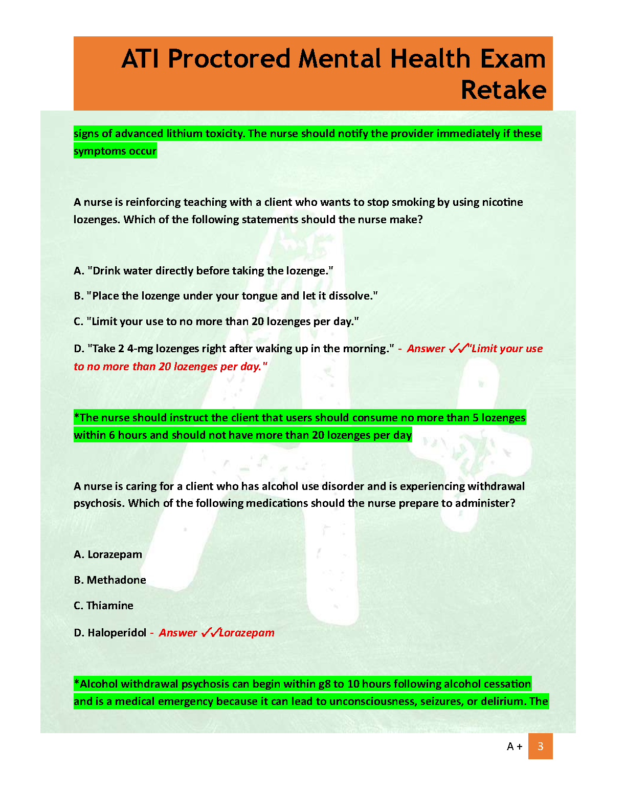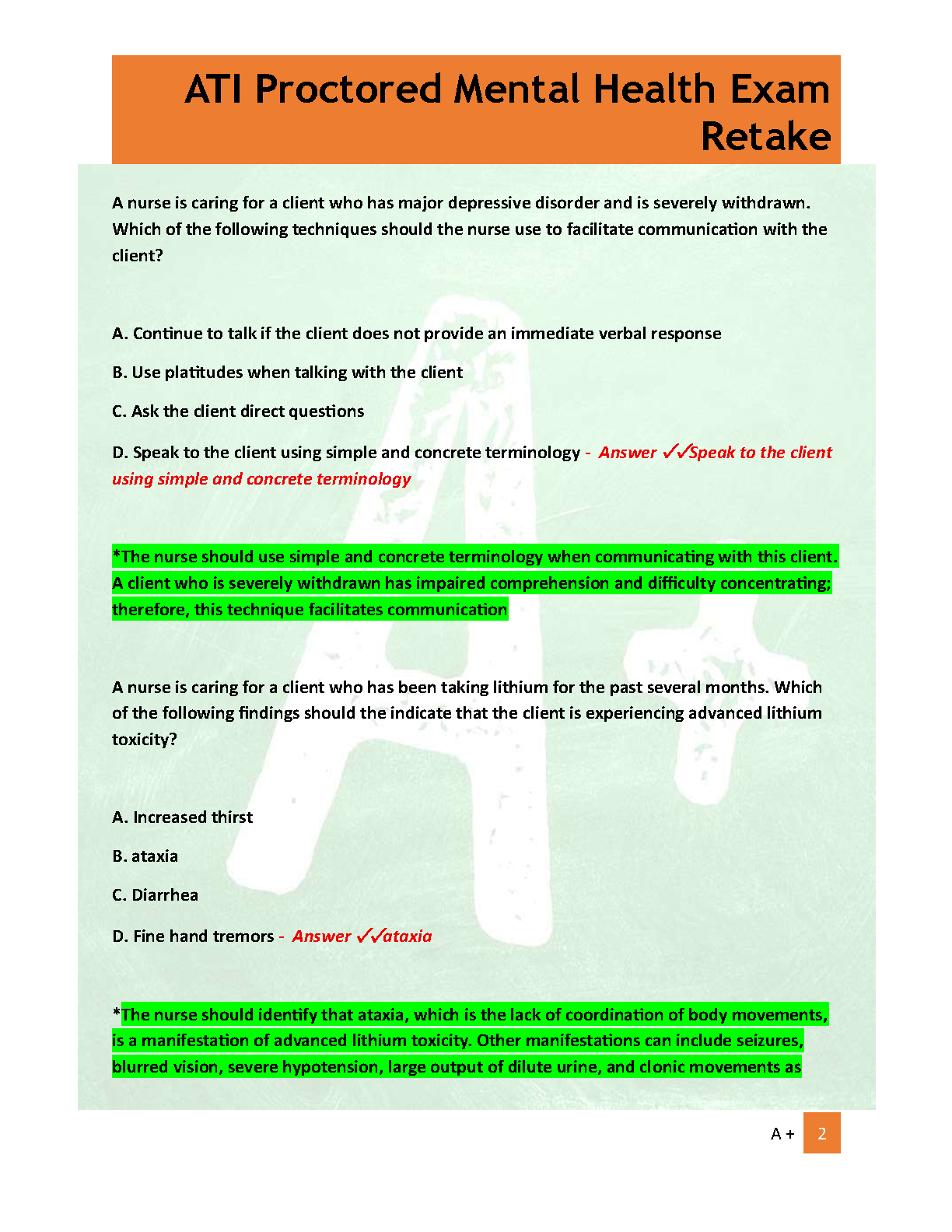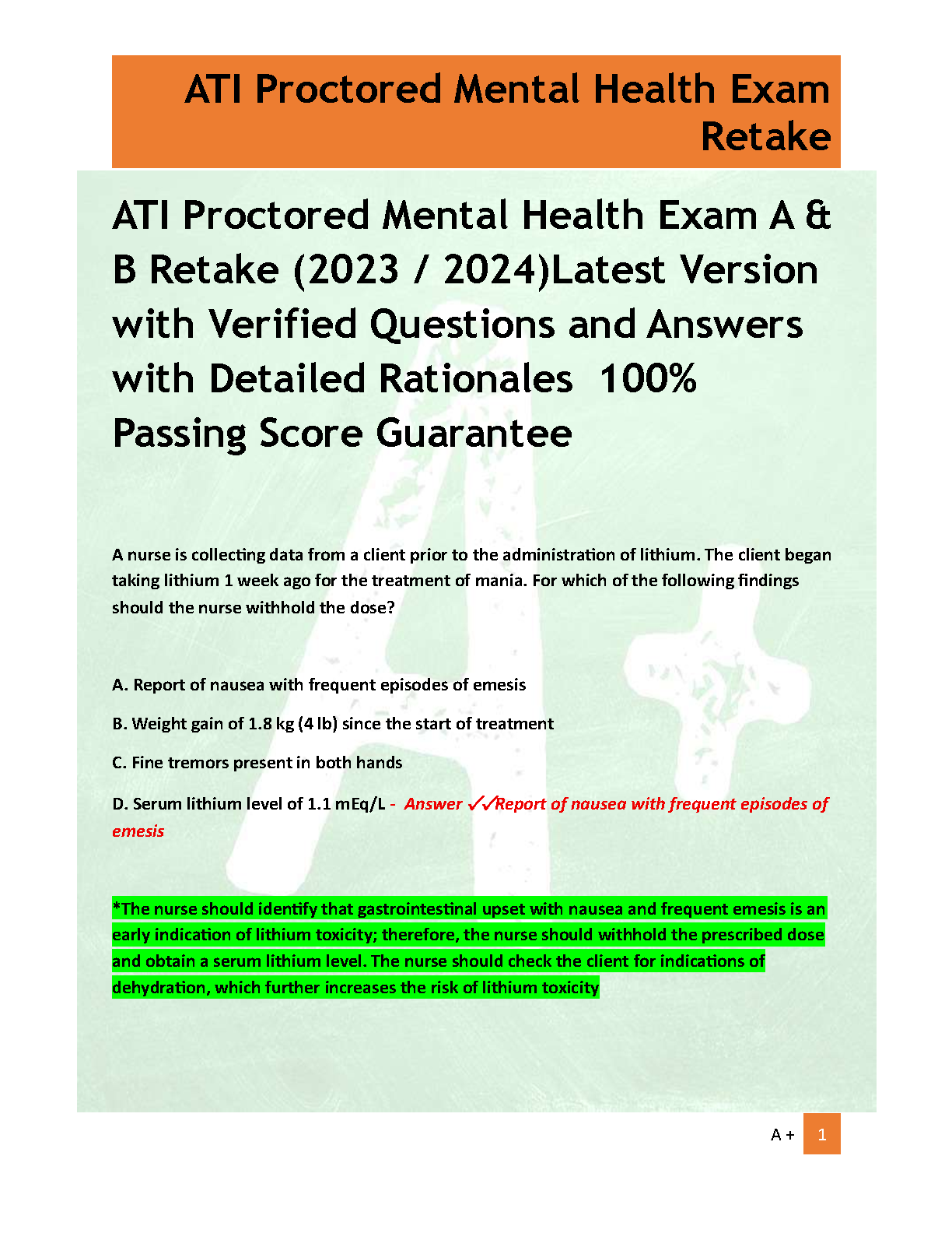 ATI Proctored Mental Health Exam A & B Retake 2023/2024 Test Bank | Verified Questions & Rationales by Assessment Technologies Institute (ATI)