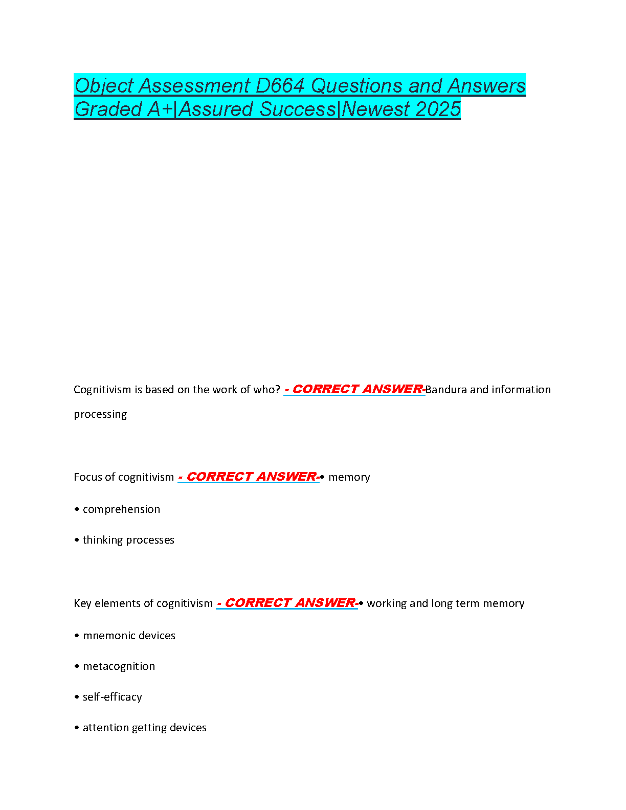 Prepare to excel in your WGU D664 Object Assessment with this comprehensive and up-to-date test bank for 2025. This resource provides a complete set of verified questions and detailed answers, covering crucial topics like the principles of cognitivism, key theorists such as Bandura, and the role of memory in learning. Designed to ensure you achieve an A+ grade, this study guide is your key to mastering the material, boosting your confidence, and passing your assessment with ease. Unlock assured success with our latest 2025 edition!