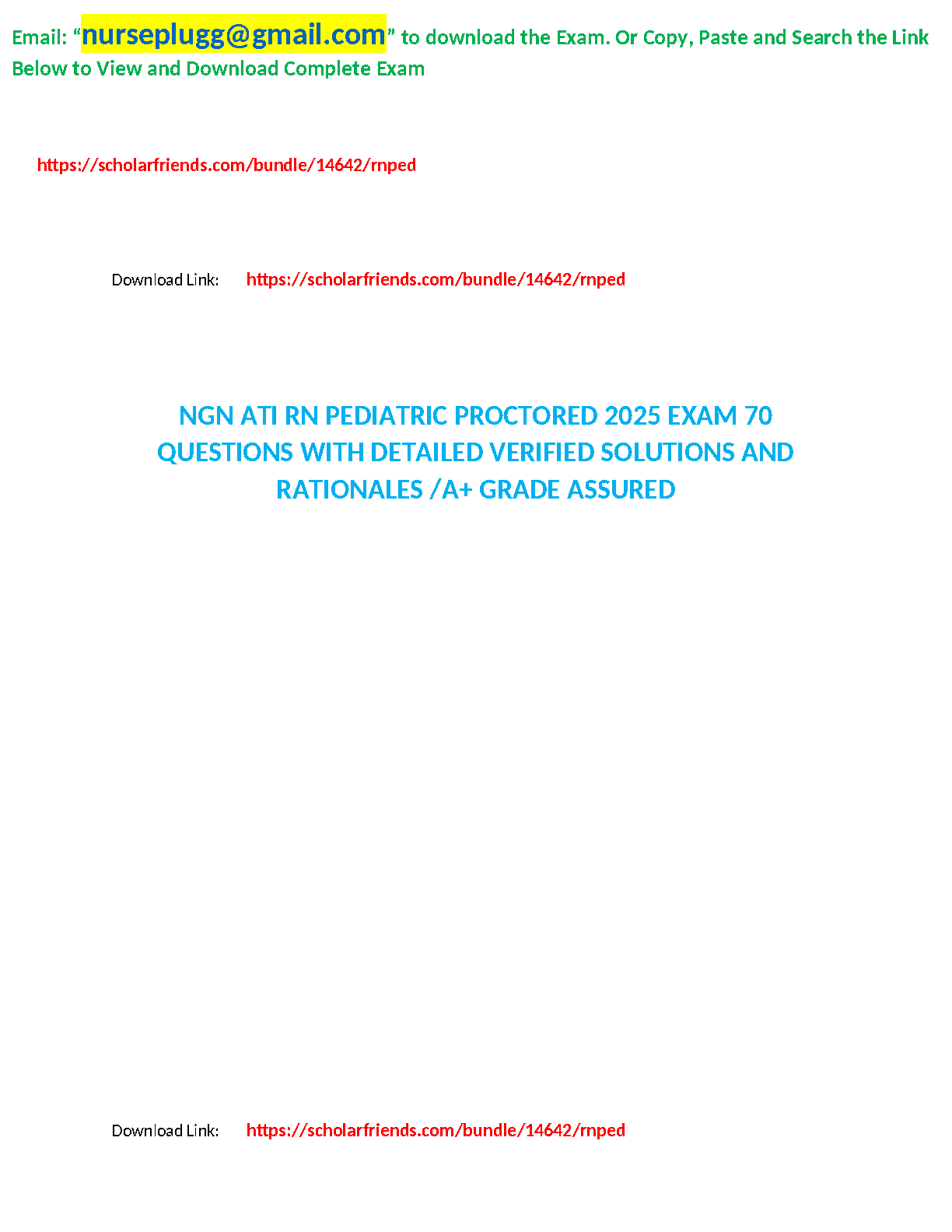 Unlock success in your pediatric nursing course with our latest 2025/2026 ATI RN Pediatric Nursing Proctored Exam Test Bank. This essential study guide is meticulously designed to help you conquer the exam on your first attempt. It features a complete set of 70 Next Generation (NGN) style questions, each accompanied by 100% verified and detailed rationales. By practicing with these targeted questions, you'll master key concepts, improve your clinical judgment, and build the confidence needed to excel. Stop worrying about resits and start preparing for a top score. Get the ultimate resource to pass your ATI Peds exam with flying colors!