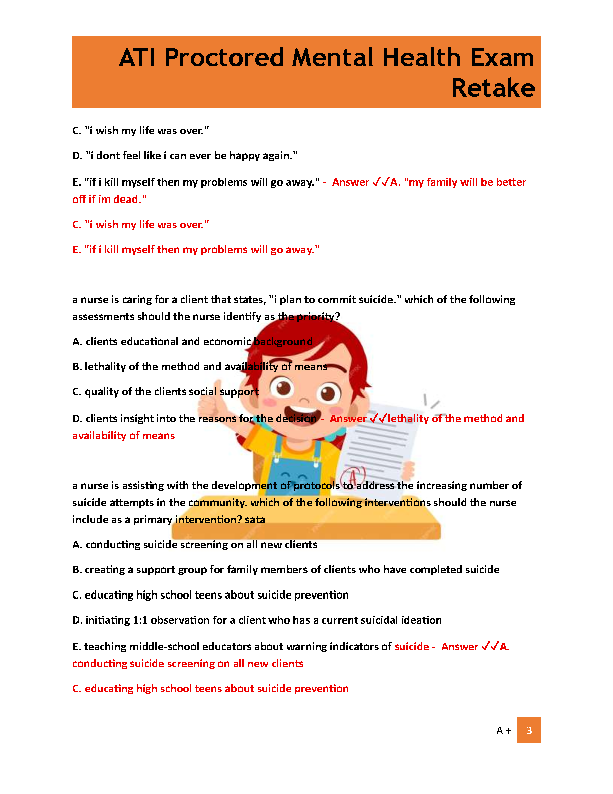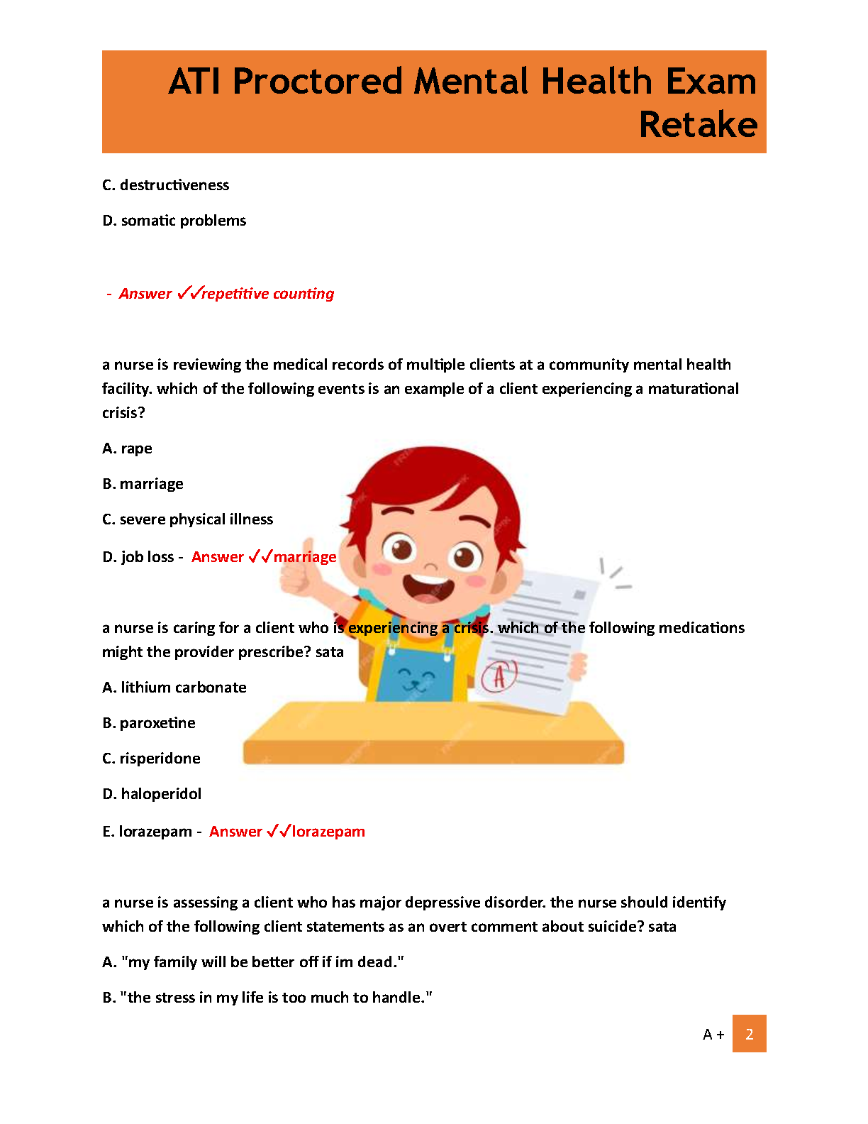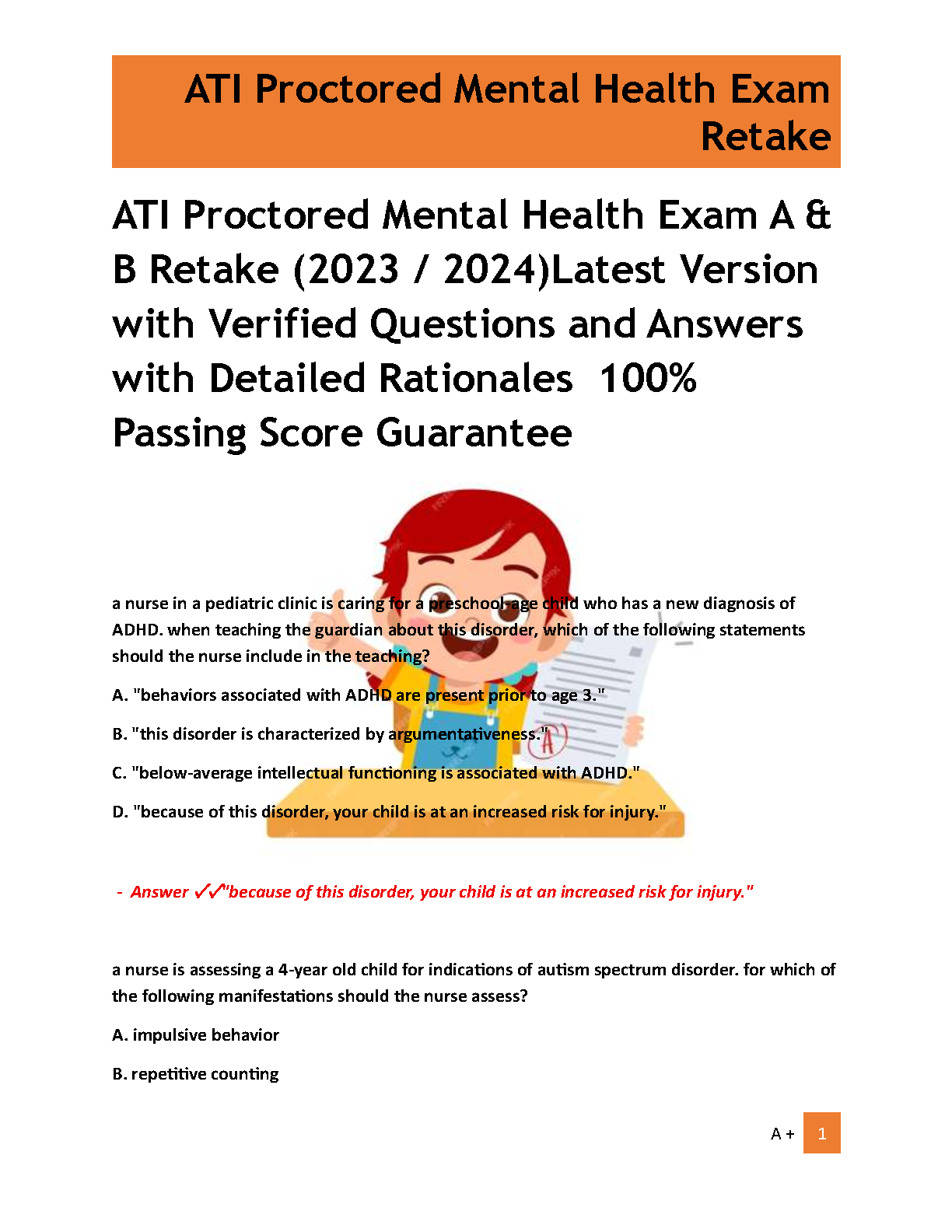 Ace your ATI Proctored Mental Health Exam with our definitive 2025/2026 test bank, specifically designed for the A & B Retake versions. This essential study guide provides a comprehensive collection of verified questions paired with detailed, easy-to-understand rationales. Master critical topics in psychiatric and mental health nursing, from pediatric conditions like ADHD to complex adult disorders. This resource is engineered to build your confidence, deepen your knowledge, and help you achieve a passing score on your very first attempt, eliminating the stress of retakes.