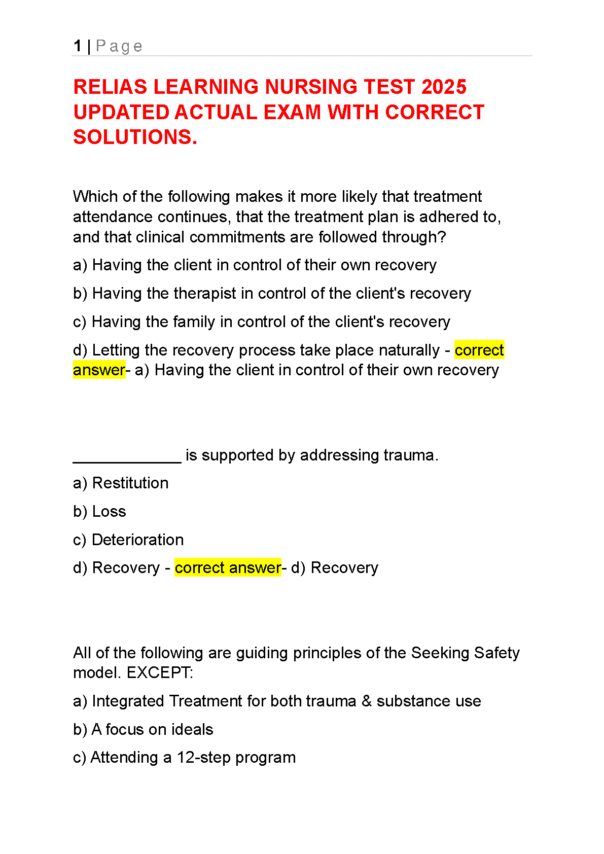 Prepare with confidence for your upcoming Relias Learning Nursing assessment with our 2025 updated test bank. This comprehensive resource features a collection of actual exam questions, complete with verified correct answers and detailed solutions. Designed for nursing students and professionals, this study guide is your key to mastering the material, understanding key concepts, and passing your exam on the first try. Don't leave your success to chance—gain the edge you need to excel and avoid resits with this essential preparation tool.