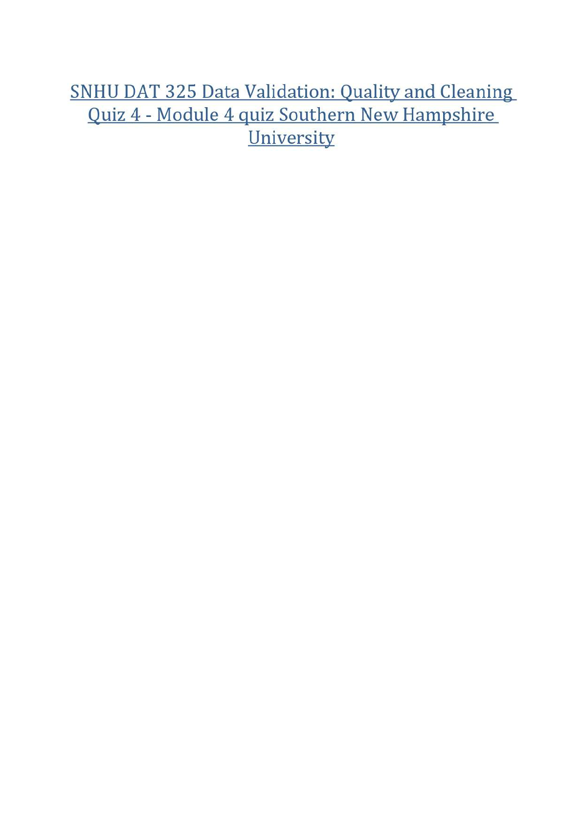 Get ready to ace your SNHU DAT 325 course with our comprehensive test bank for the Module 4 Quiz on Data Validation: Quality and Cleaning. This latest 2025/2026 study resource is expertly designed to help you master the material and pass your exam with confidence on the first attempt. Avoid resits by studying with verified questions and detailed answers that cover all the key topics from Module 4. Download now for immediate access and take the first step towards achieving top grades in your data validation course.