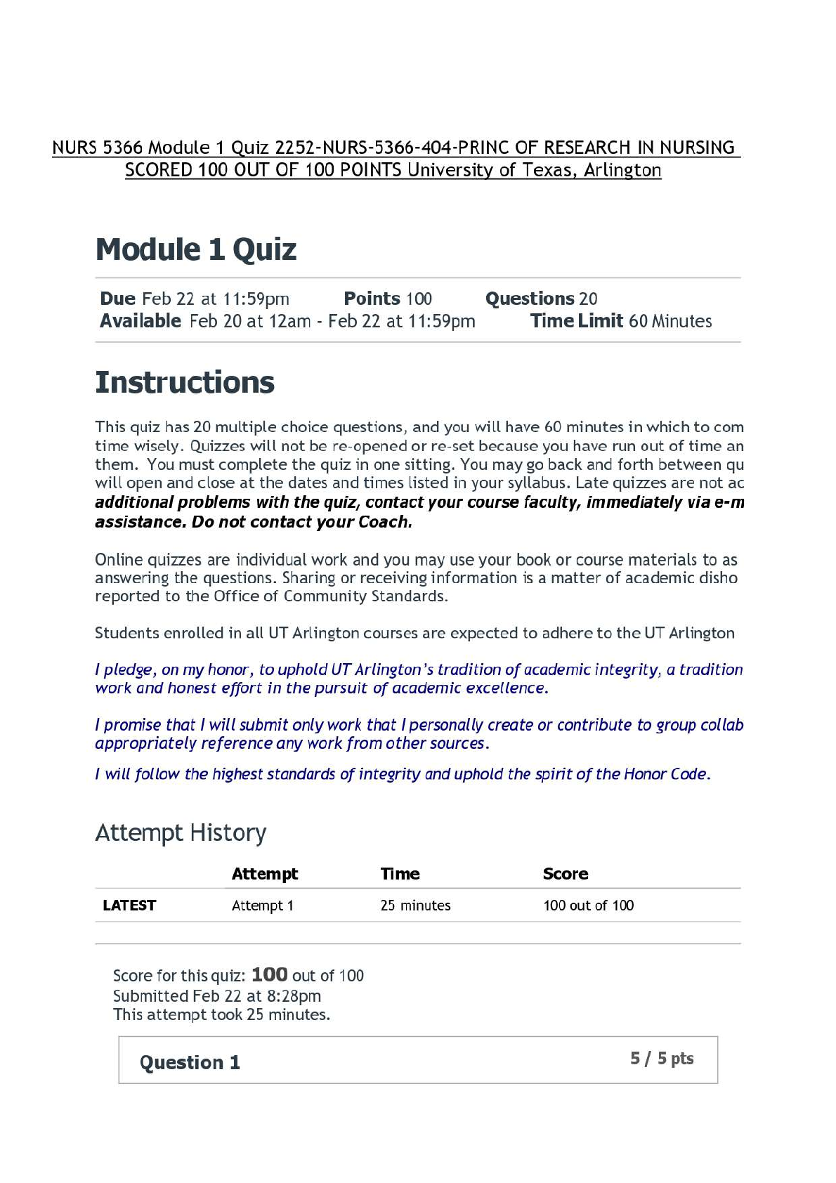 NURS 5366 Principles of Research in Nursing Module 1 Quiz Test Bank | Verified 100% Score | University of Texas, Arlington