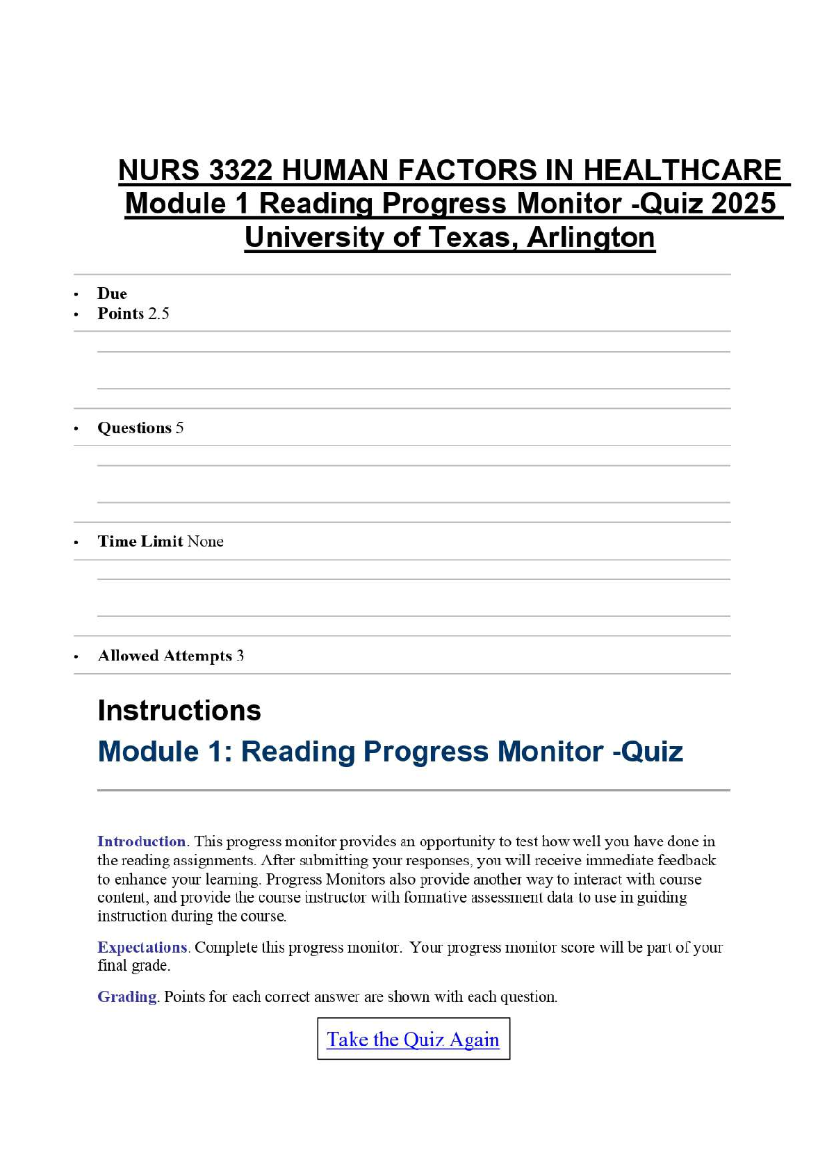 Gain a competitive edge in your NURS 3322 course with this comprehensive test bank for the Module 1 Reading Progress Monitor Quiz from the University of Texas, Arlington. Fully updated for the 2025-2026 academic year, this study guide is meticulously designed to help you master the core principles of human factors in healthcare. This resource aligns perfectly with the textbook 'Human Factors and Ergonomics in Health Care and Patient Safety, 3rd Edition' by Pascale Carayon. Prepare effectively, understand key concepts, and confidently answer exam questions to pass on your first try and avoid resits. Download today for immediate access to the tools you need for success!