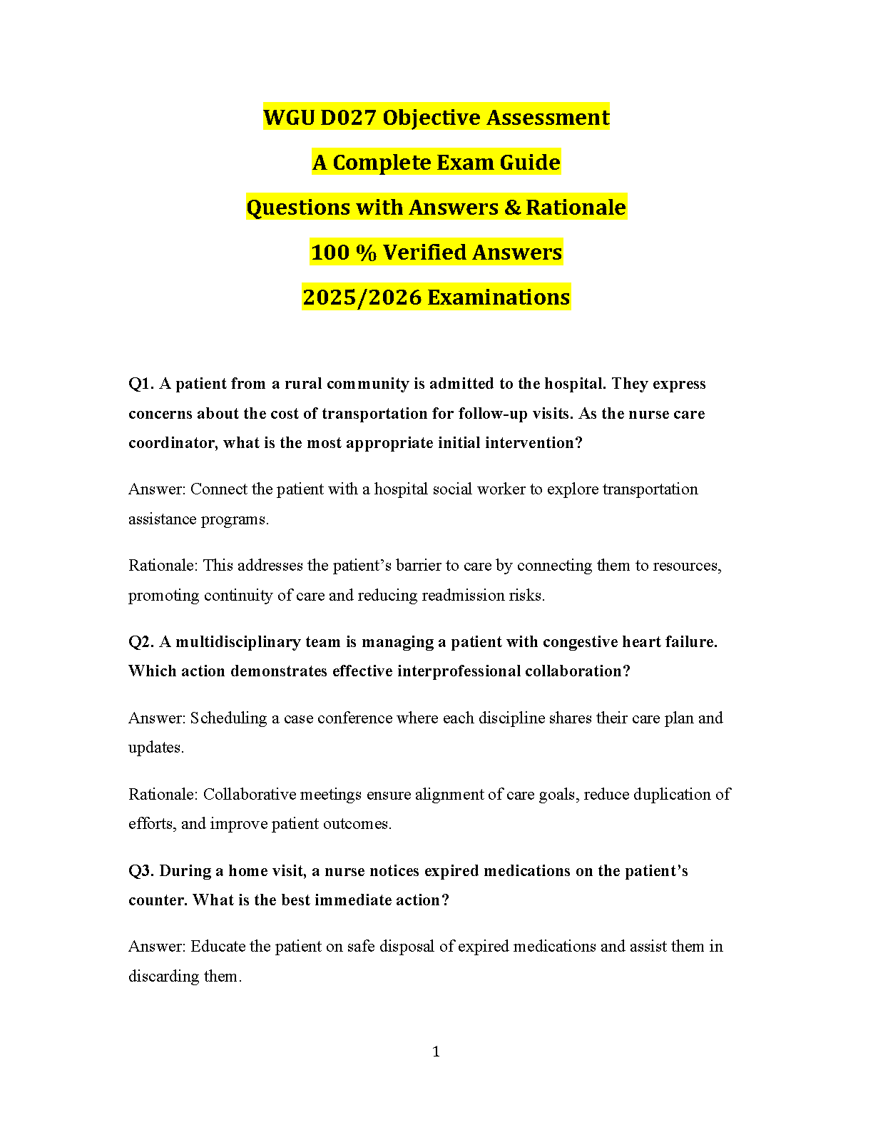 WGU D027 Leadership and Quality Objective Assessment Exam Guide 2025/2026 | Verified Q&A with Rationales to Ace Your Test