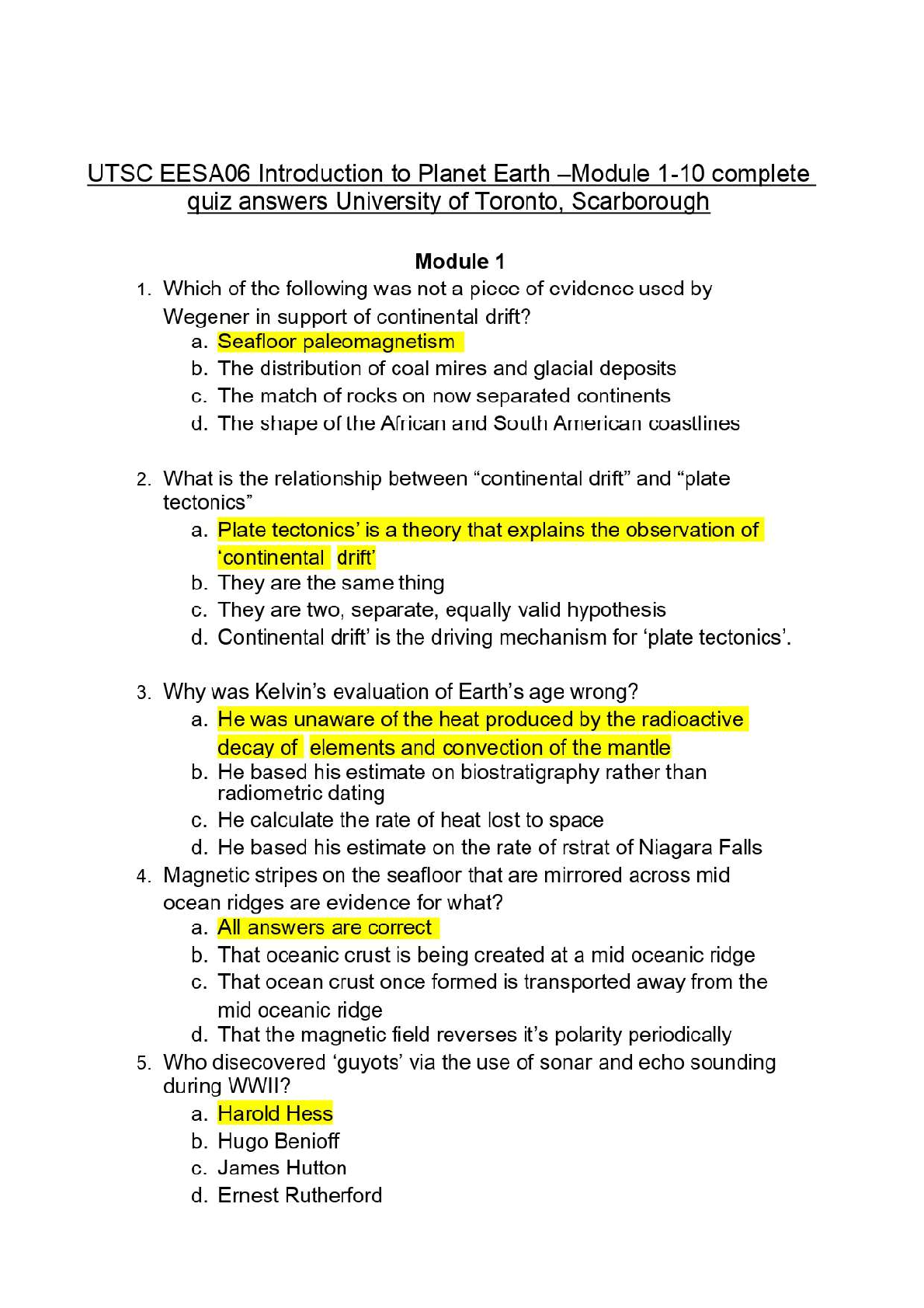 Instantly access the complete Test Bank for UTSC's EESA06: Introduction to Planet Earth. This comprehensive resource contains all quiz questions with verified, correct answers for Modules 1-10. Based on 'Earth: An Introduction to Physical Geology' by Tarbuck, Lutgens, & Tasa, this study guide is meticulously designed to help you master fundamental concepts, from plate tectonics to geological time. Excel in your coursework, ace your exams, and secure a high grade with this essential EESA06 preparation tool.