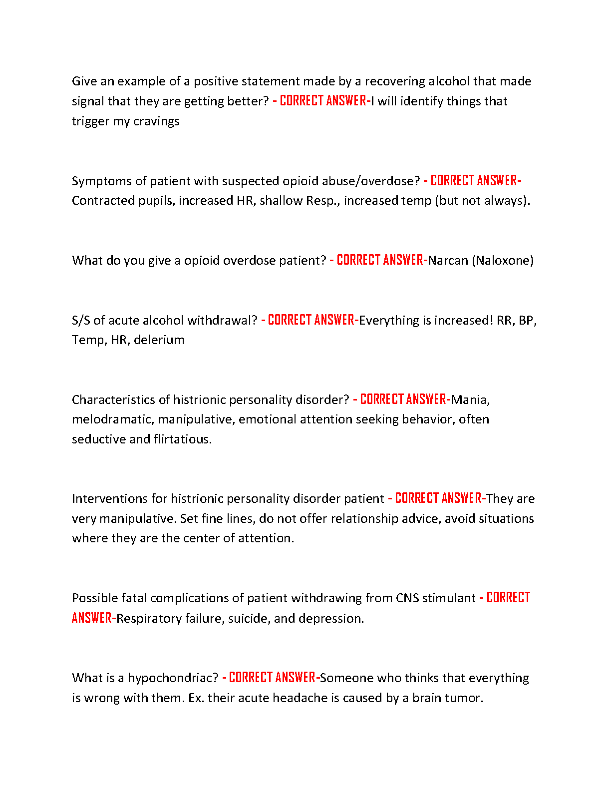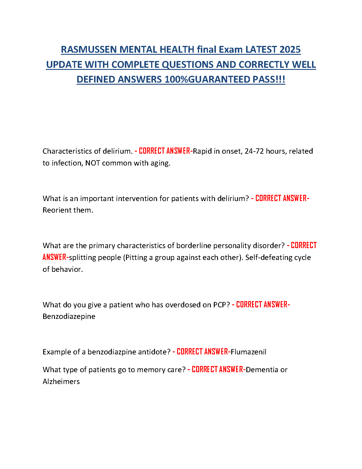 Prepare to ace your Rasmussen Mental Health final exam with our comprehensive 2025 test bank. This essential study guide is packed with a complete set of questions and 100% correct, verified answers, designed to help you master the course material and pass with confidence. Covering critical topics like delirium, borderline personality disorder, psychopharmacology, and patient interventions, this resource is your key to success. Eliminate exam stress and study effectively to pass on your first attempt. Ideal for all Rasmussen nursing students taking the Mental Health course.