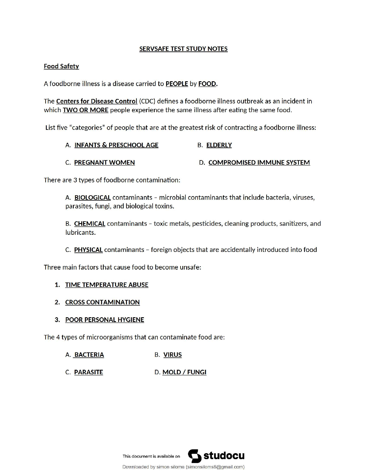 Master the essentials of food safety and pass your ServSafe certification exam on the very first attempt with our updated 2025/2026 study notes! This comprehensive guide is specifically tailored to the ServSafe Manager Book, 8th Edition by the National Restaurant Association. It breaks down critical topics into easy-to-digest points, covering everything from the definition of foodborne illnesses and high-risk populations to the three types of contamination (Biological, Chemical, and Physical). Learn the crucial factors that make food unsafe, such as time-temperature abuse, cross-contamination, and poor personal hygiene. Stop stressing about resits and equip yourself with the knowledge you need to succeed. Get your ServSafe certification with confidence!