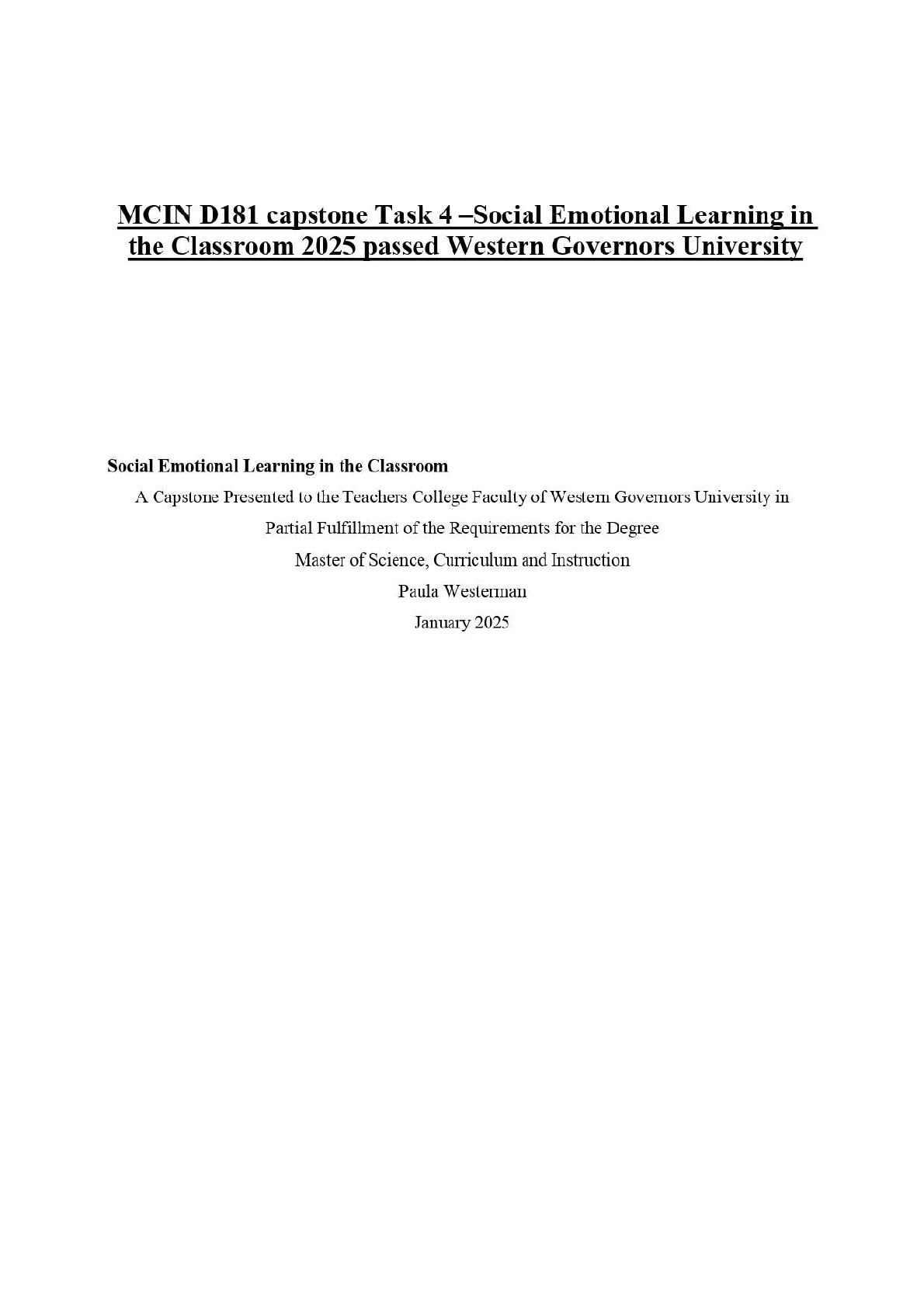 Struggling with your MCIN D181 Capstone Task 4 at Western Governors University? Unlock success with this officially passed project on 'Social Emotional Learning in the Classroom' by Paula Westerman. This comprehensive resource, updated for the 2025/2026 academic year, provides a clear, A-grade example to guide your own work. Follow this proven structure and content to master the requirements, save valuable study time, and ensure you pass your capstone on the very first attempt. Avoid the stress of resits and confidently submit your project with this essential guide.