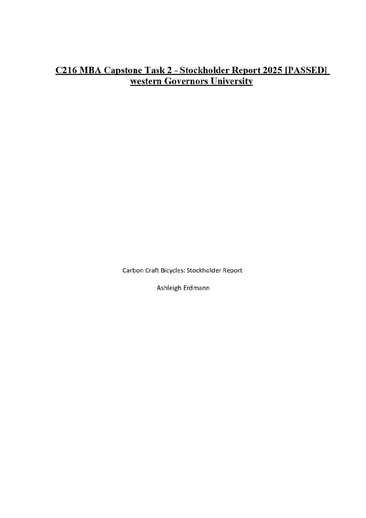 Ace your Western Governors University MBA Capstone with this verified, passed submission for C216 Task 2. This 2025 Stockholder Report for the 'Carbon Craft Bicycles' case provides a complete and exemplary model to guide you. Updated for the 2025/2026 academic year, this resource is expertly crafted to help you understand the requirements, structure your report effectively, and pass on your first attempt, avoiding costly resits. Eliminate guesswork and secure your grade with this essential study aid.
