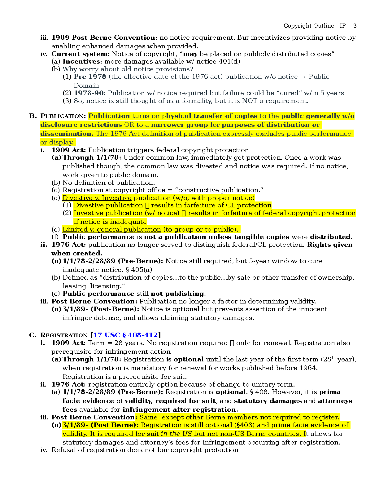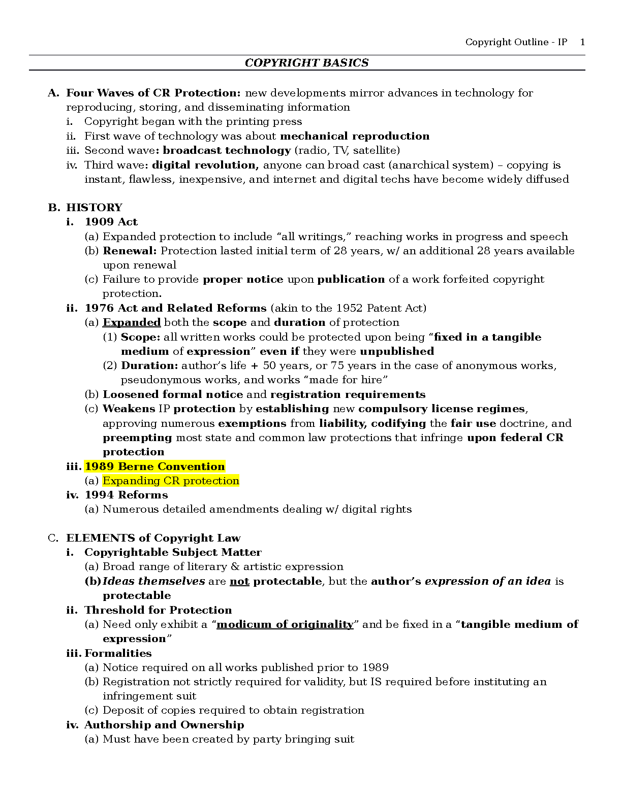 Unlock a complete understanding of Copyright Law with our expertly crafted 2025/2026 study guide. This comprehensive outline covers all the essential topics, from the four waves of copyright protection and the history of key legislation (1909 Act, 1976 Act, Berne Convention) to the fundamental elements of copyrightable subject matter, originality, and ownership. Designed to simplify complex legal concepts, these notes are your key to acing your Intellectual Property exam on the first try and avoiding costly resits.