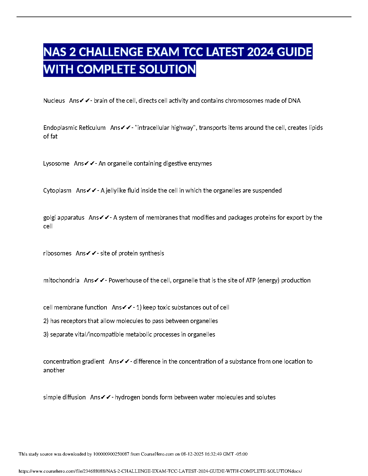 Unlock success in your TCC NAS 2 Challenge Exam with our comprehensive 2024 test bank. This guide features a complete collection of exam-style questions and expertly verified answers, covering key topics in cell biology and fundamental principles. Designed to help you master the material efficiently, this resource is your key to passing the exam with confidence. Get immediate access to all the solutions you need to excel.