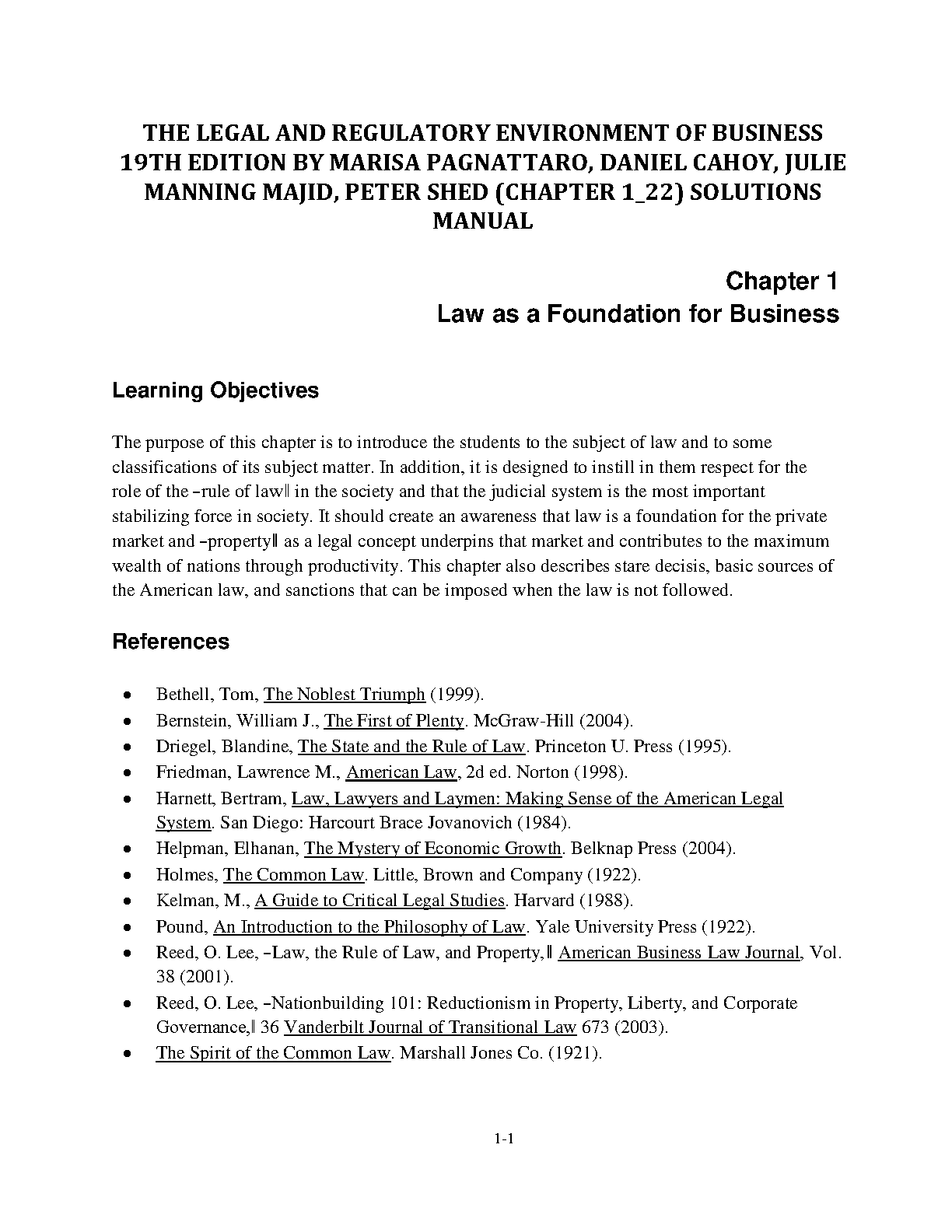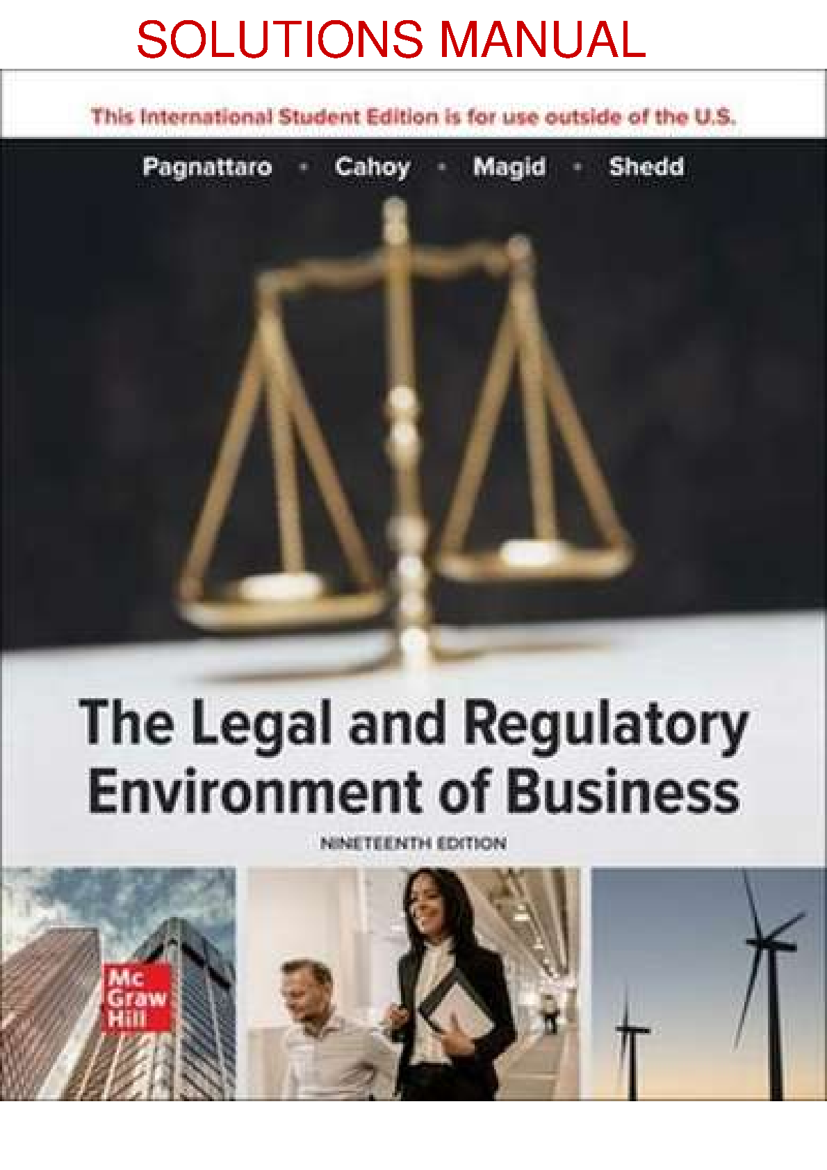 Solutions Manual for The Legal and Regulatory Environment of Business, 19th Edition by Marisa Anne Pagnattaro, Daniel R. Cahoy, Julie Manning Magid, and Peter Shedd