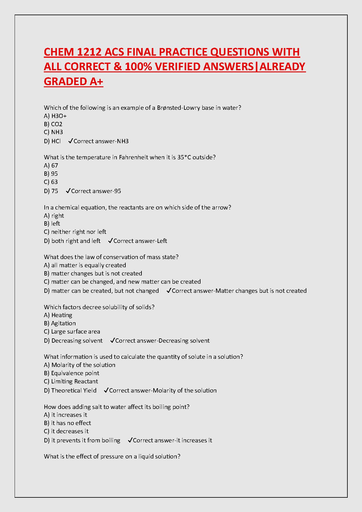 CHEM 1212 ACS Final Exam Test Bank: Practice Questions with 100% Verified Answers (Graded A+) for First-Attempt Success