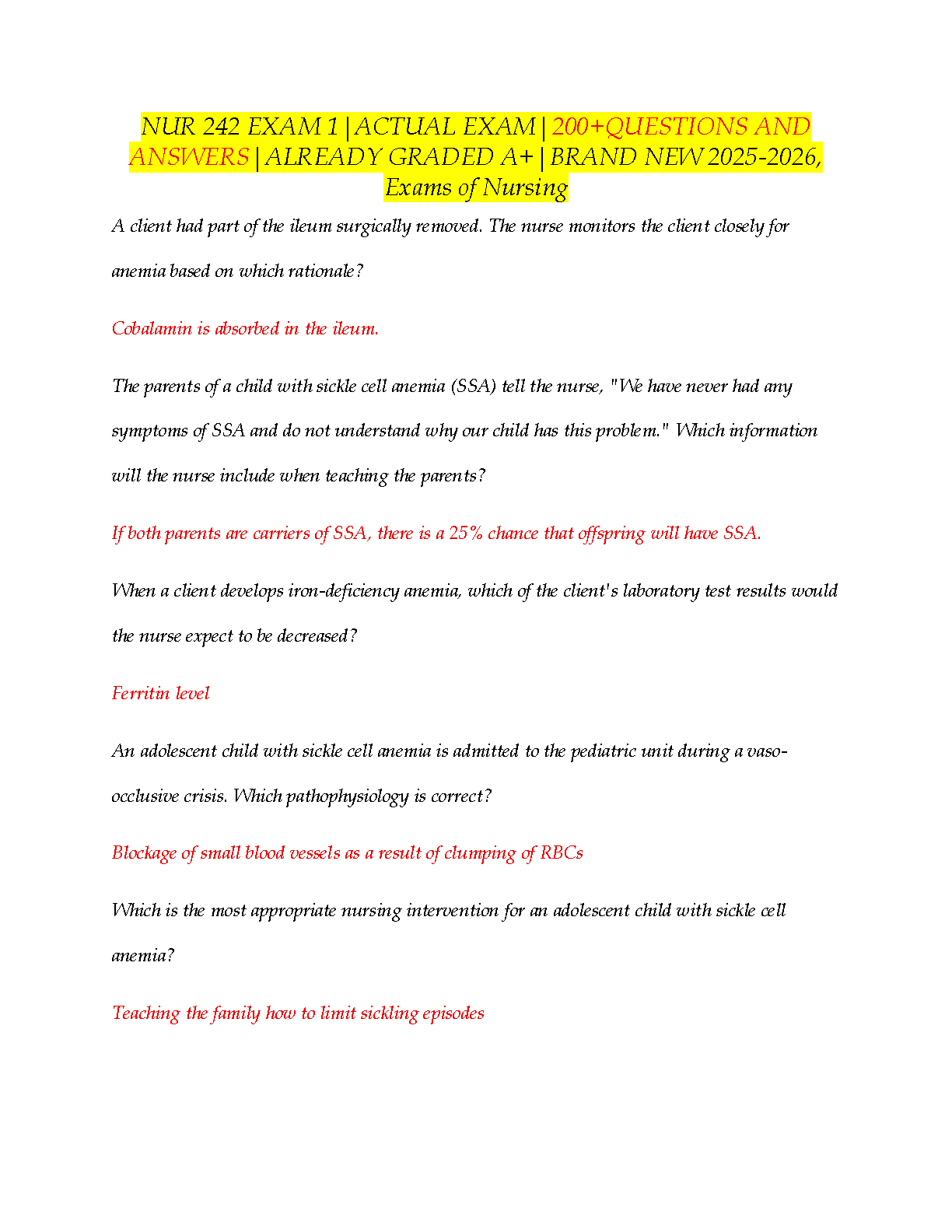 Prepare to excel in your nursing studies with our latest NUR 242 Exam 1 Test Bank for the 2025-2026 academic year. This comprehensive resource features over 200 meticulously curated questions and verified answers, mirroring the format and difficulty of the actual exam. Proven to help students achieve A+ grades, this study guide is your key to mastering complex nursing concepts and passing your exam with confidence on the very first try. Avoid resits and secure top marks with this essential exam preparation tool.