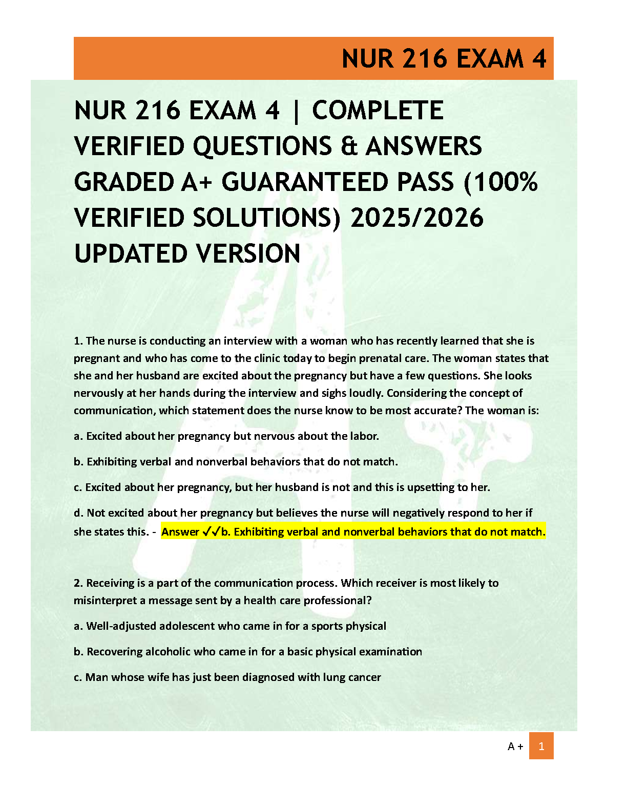 Ace your NUR 216 Exam 4 with our comprehensive and fully verified test bank for the 2025/2026 academic year. This essential study resource provides a complete set of questions with 100% correct, detailed answers, covering all the critical topics you'll face on the exam. Designed to help you study smarter, not harder, this guide is your key to achieving an A+ grade and passing with confidence on your first try. Download now to get the latest updated materials for NUR 216.