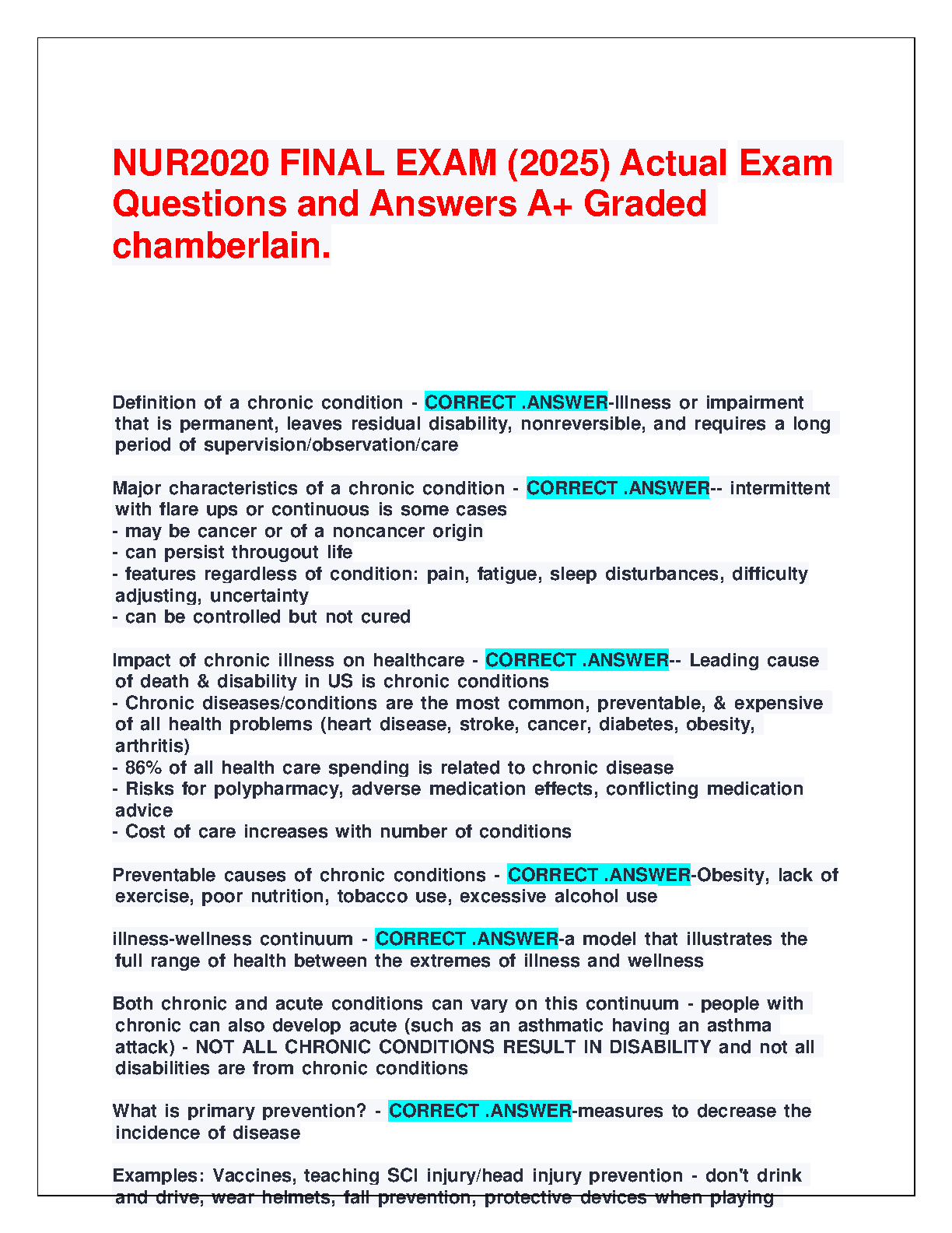 Ace your NUR2020 Final Exam at Chamberlain University with our meticulously compiled 2025 test bank. This essential study guide provides a complete set of actual exam questions paired with verified, A+ graded answers. Master key nursing concepts, from the definition of chronic conditions to primary prevention strategies, and walk into your exam with confidence. Designed for success, this resource is your key to not just passing, but excelling in your NUR2020 course.