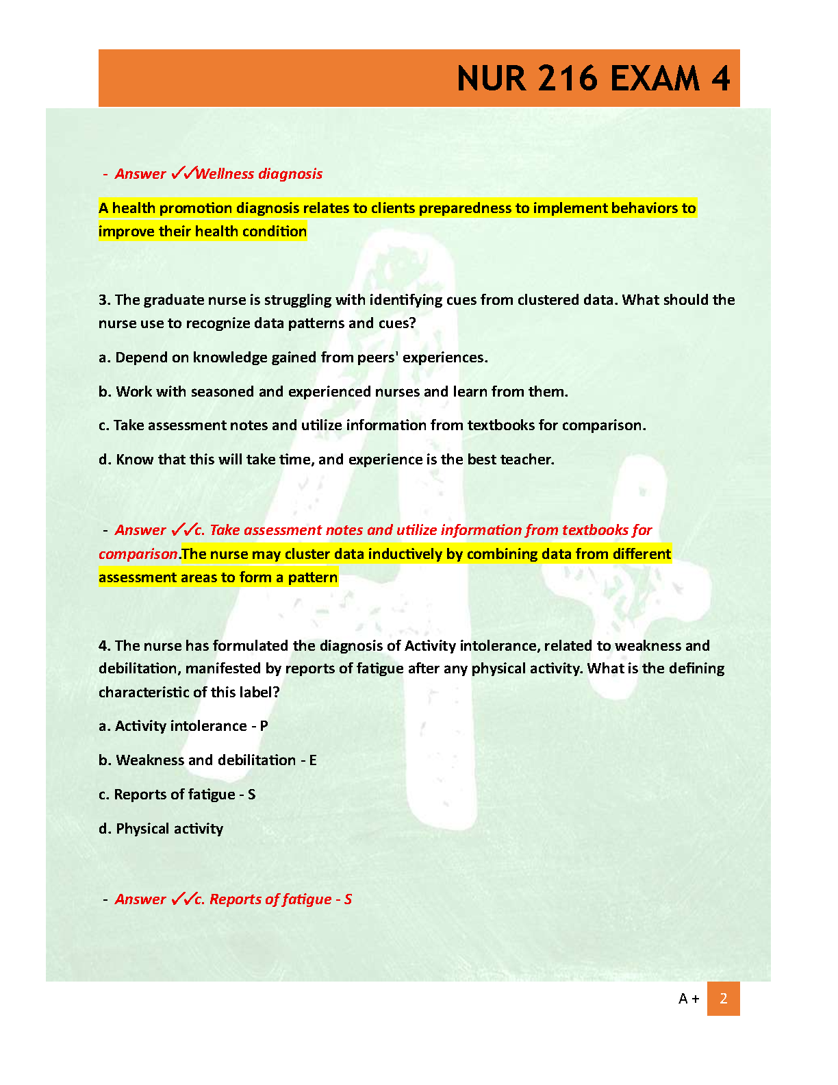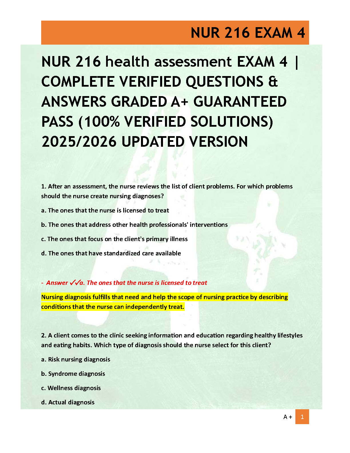 Master the concepts of Health Assessment with our comprehensive test bank for NUR 216 Exam 4. This latest 2025/2026 updated version includes a full set of verified questions with 100% correct answers and detailed rationales. Designed to help you ace your exam and achieve an A+ grade, this study guide is your key to passing on the first try. Get instant access and start preparing effectively today!