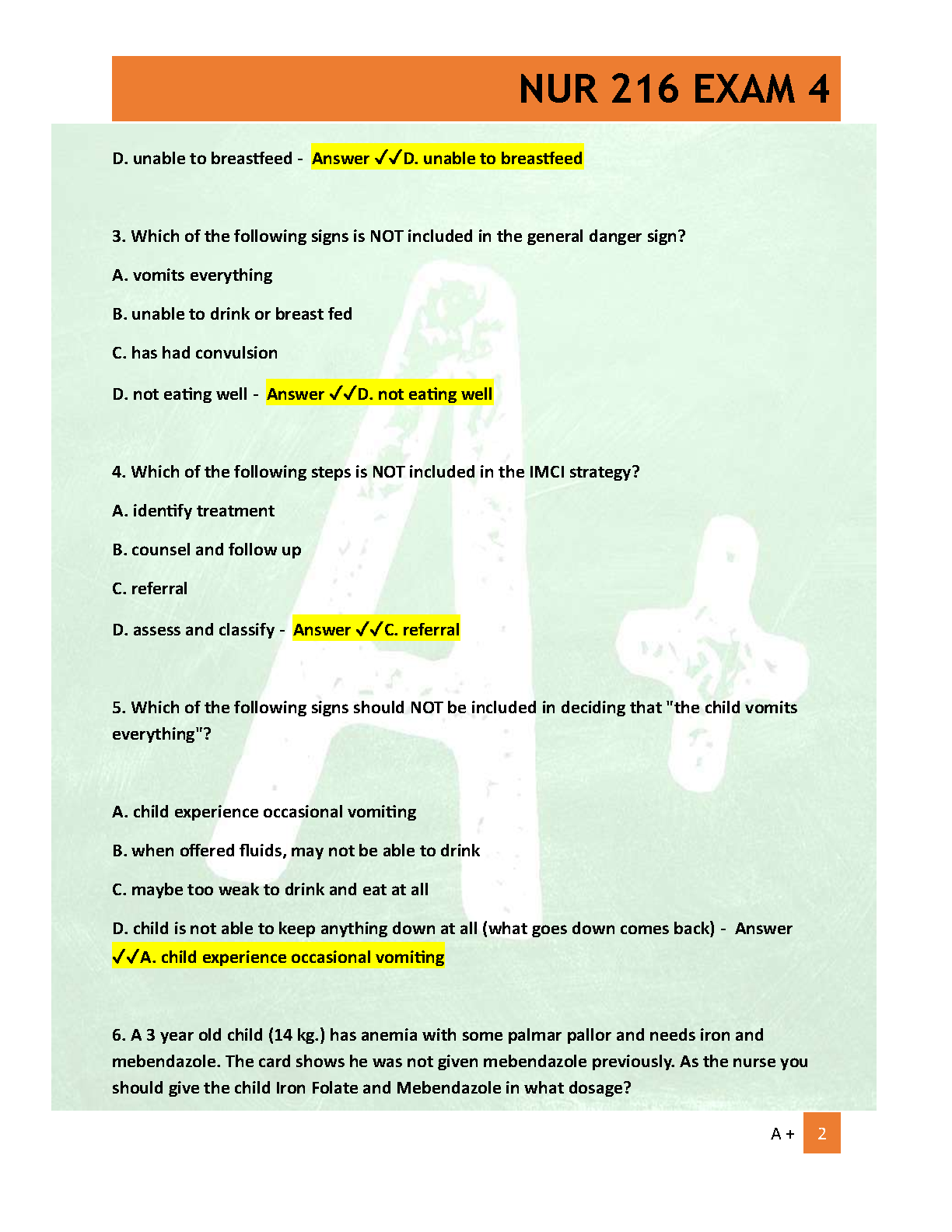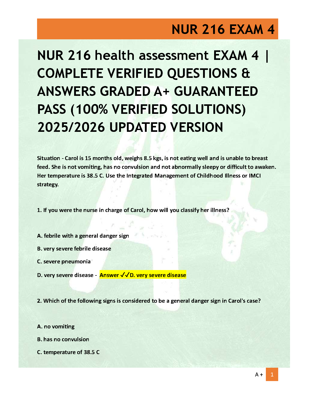 Ace your NUR 216 Health Assessment Exam 4 with our comprehensive test bank, fully updated for the 2025/2026 academic year. This resource provides a complete set of verified questions and detailed, A+-graded answers to ensure you pass on your first attempt. Covering all essential topics, including pediatric assessment scenarios like IMCI, this study guide is expertly designed to help you master the course material, boost your confidence, and achieve top scores. Download now for a guaranteed pass and avoid resits!