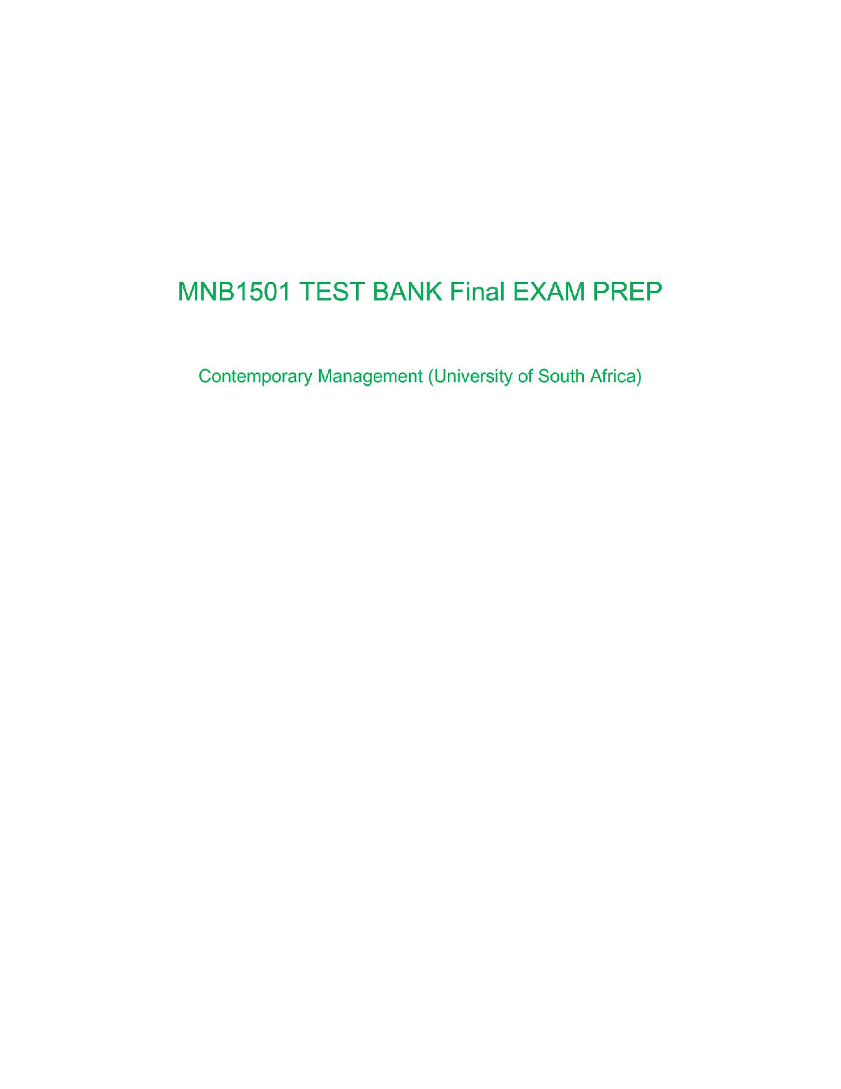 Unlock success in your University of South Africa (UNISA) studies with this comprehensive test bank for MNB1501: Contemporary Management. Based on the 12th Edition by Jones and George, this essential resource is your key to mastering the final exam. Packed with hundreds of practice questions and detailed answers, it covers every crucial topic you'll face. Prepare effectively, boost your confidence, and achieve top grades. Get instant access to the MNB1501 test bank and be fully prepared for your exam.