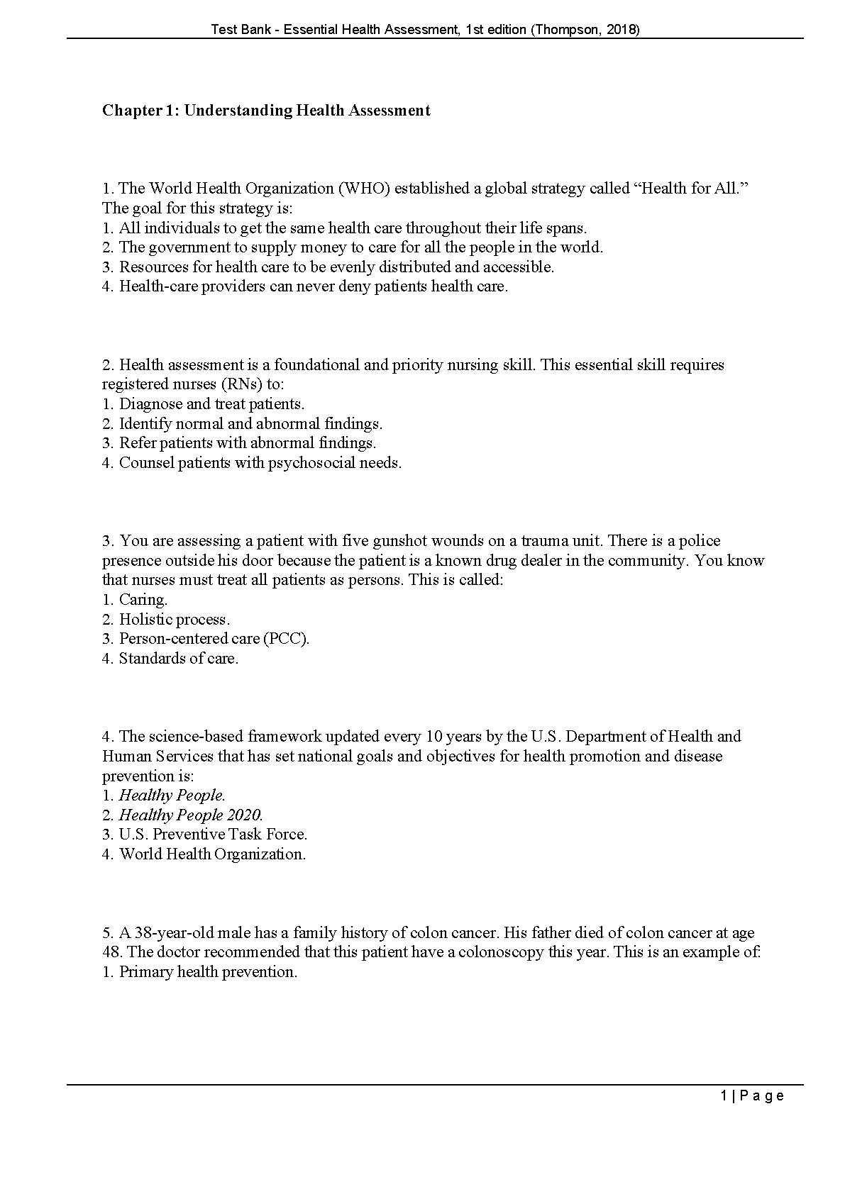 Test Bank for Essential Health Assessment, 1st Edition by Janice M. Thompson and Rosalyn P. Ferguson