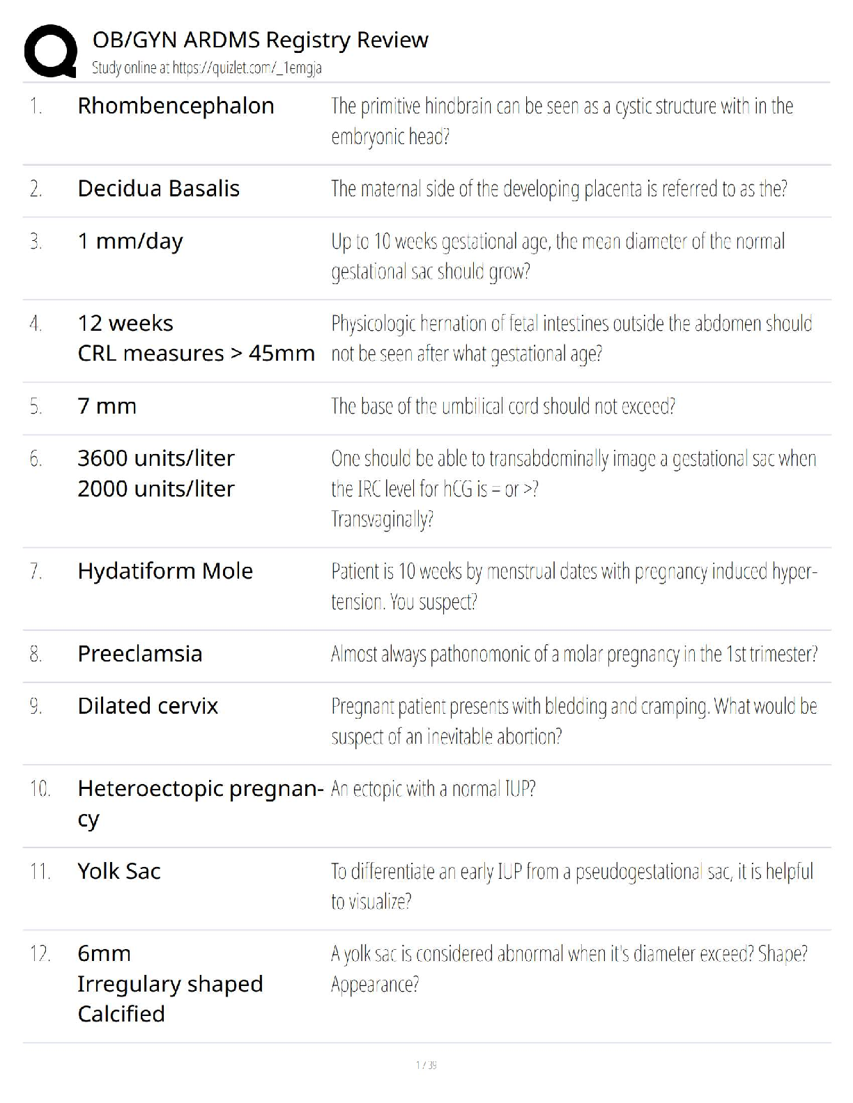 Master the ARDMS OB/GYN Registry Exam with our comprehensive test bank. This detailed Q&A study guide covers all essential topics you need to know for your sonography certification. Inside, you'll find a thorough review of key concepts including early pregnancy, fetal anatomy, gestational measurements, and critical pathologies like preeclampsia and molar pregnancies. Each question is paired with a direct answer, making it the perfect tool for efficient studying and ensuring you're fully prepared to pass your exam with confidence.