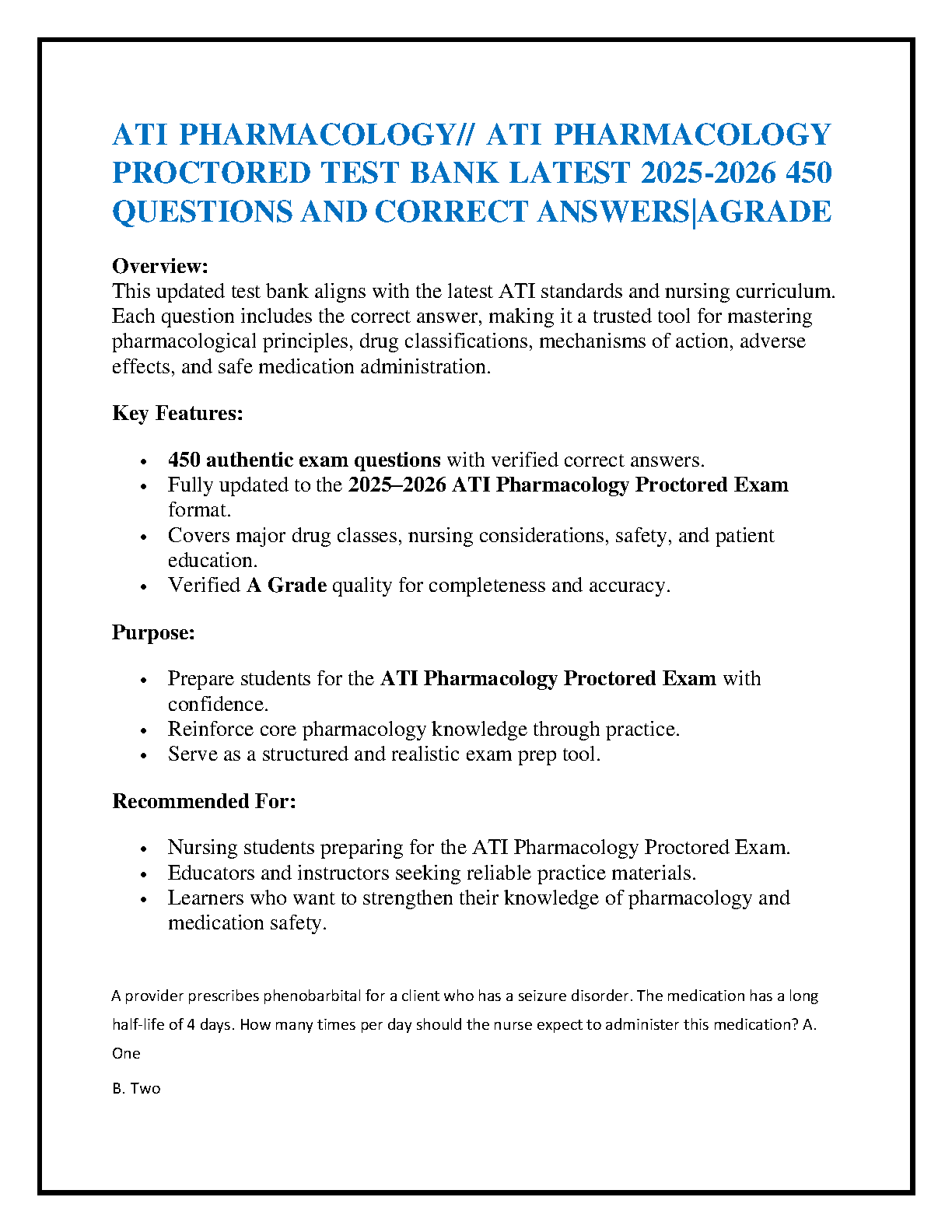 Achieve top marks on your ATI Pharmacology Proctored Exam with our latest 2025-2026 Test Bank. This comprehensive resource features 450 authentic exam-style questions, each with a verified and detailed answer. Designed to align perfectly with the current ATI nursing curriculum, this guide covers all essential topics, including drug classifications, mechanisms of action, nursing considerations, and safe medication administration. Prepare with confidence, master key pharmacological concepts, and secure an A-grade performance on your first attempt. Ideal for nursing students seeking a reliable and structured study tool.