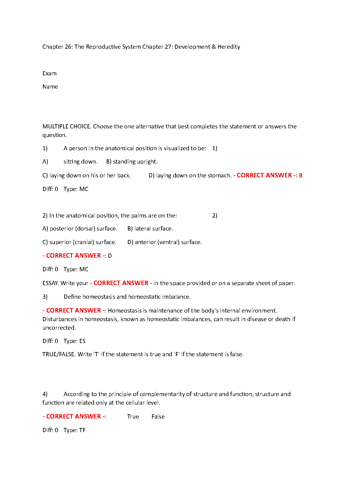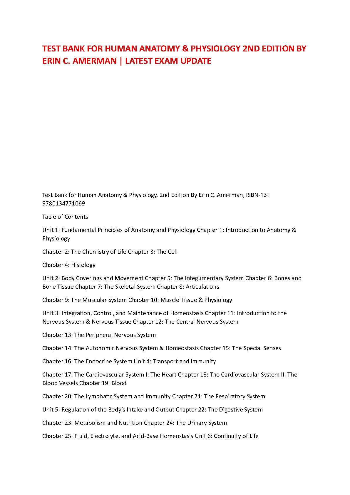 Master your Human Anatomy & Physiology course with this comprehensive Test Bank for the 2nd Edition by Erin C. Amerman. This is not the textbook; it is a complete collection of exam questions and verified answers that directly correspond to the chapters in the book (ISBN: 9780134771069). Covering all 25 chapters, from fundamental principles to the nervous, cardiovascular, and digestive systems, this resource is designed to help you prepare effectively for quizzes and exams. Deepen your understanding, practice with real test-style questions, and build the confidence to excel in your studies. Download now and start studying smarter!