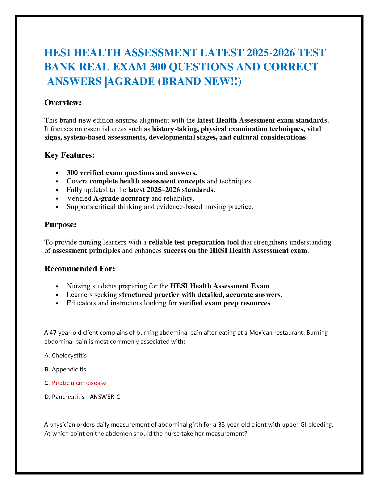 Master the HESI Health Assessment exam with our comprehensive 2025-2026 Test Bank. This brand-new resource is expertly designed to help you pass on your first attempt and achieve top grades. Inside, you'll find 300 meticulously verified real exam questions complete with correct answers and detailed explanations. Our guide covers all essential topics, including patient history-taking, physical examination techniques, system-based assessments, and vital signs. Fully updated to the latest 2025-2026 standards, this test bank is the ultimate study tool for nursing students seeking A-grade accuracy and confidence on exam day.