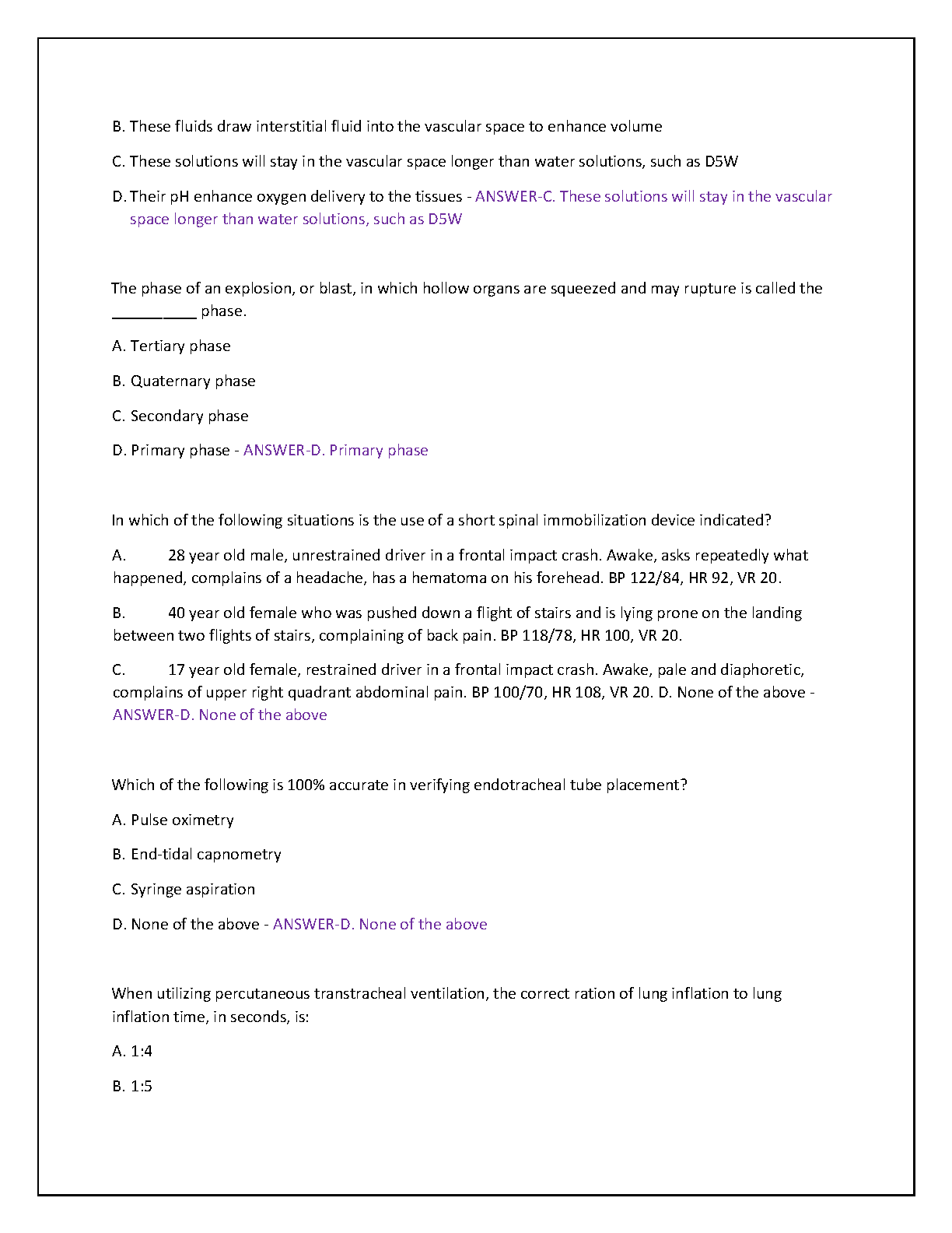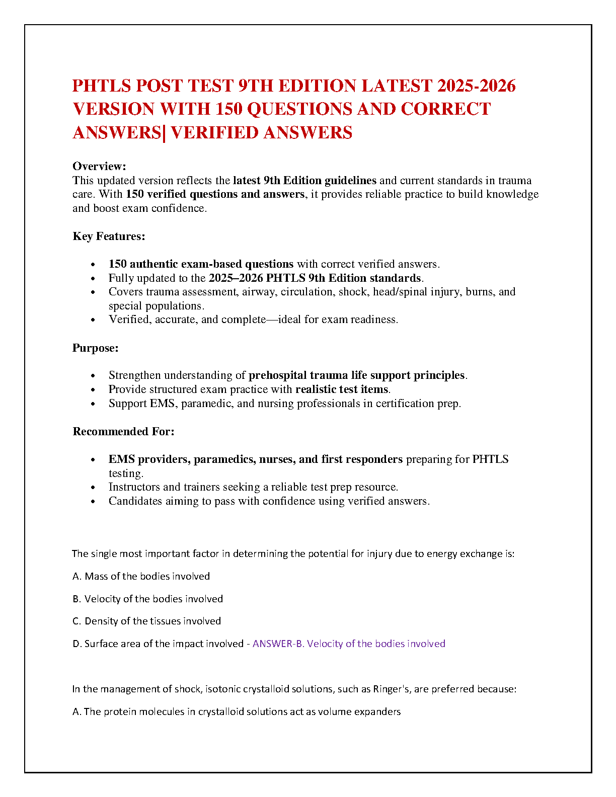 Ace your PHTLS certification on the first try with our comprehensive test bank for NAEMT's Prehospital Trauma Life Support, 9th Edition. This essential study guide features 150 meticulously curated, exam-style questions complete with verified answers, fully aligned with the latest curriculum standards. Master key concepts in trauma assessment, airway management, shock, circulation, and more. Designed for EMS providers, paramedics, and nurses, this resource provides realistic exam practice to build your knowledge, boost your confidence, and ensure you pass your PHTLS post-test with ease.