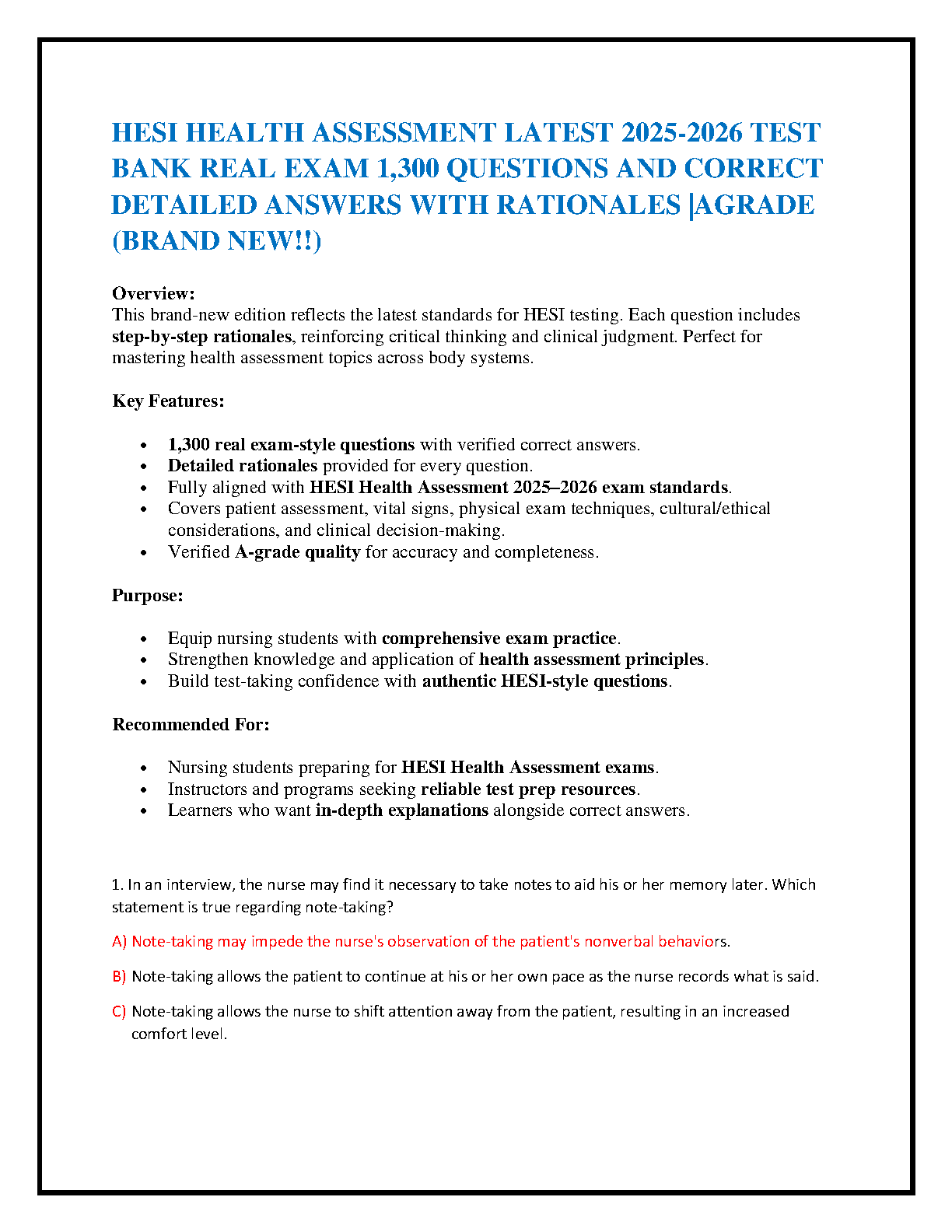 Ace your HESI Health Assessment exam with this comprehensive and up-to-date 2025-2026 test bank. This brand-new resource is meticulously designed to help you pass on your first attempt, featuring over 1,300 real exam-style questions. Each question comes with a verified correct answer and a detailed, step-by-step rationale to enhance your critical thinking and clinical judgment. Fully aligned with the latest HESI exam standards, this A-grade quality guide covers all essential topics, including patient assessment, vital signs, and physical examination techniques. Build your confidence, strengthen your knowledge, and master the material needed for success. Perfect for nursing students seeking a reliable and in-depth study tool to avoid resits.