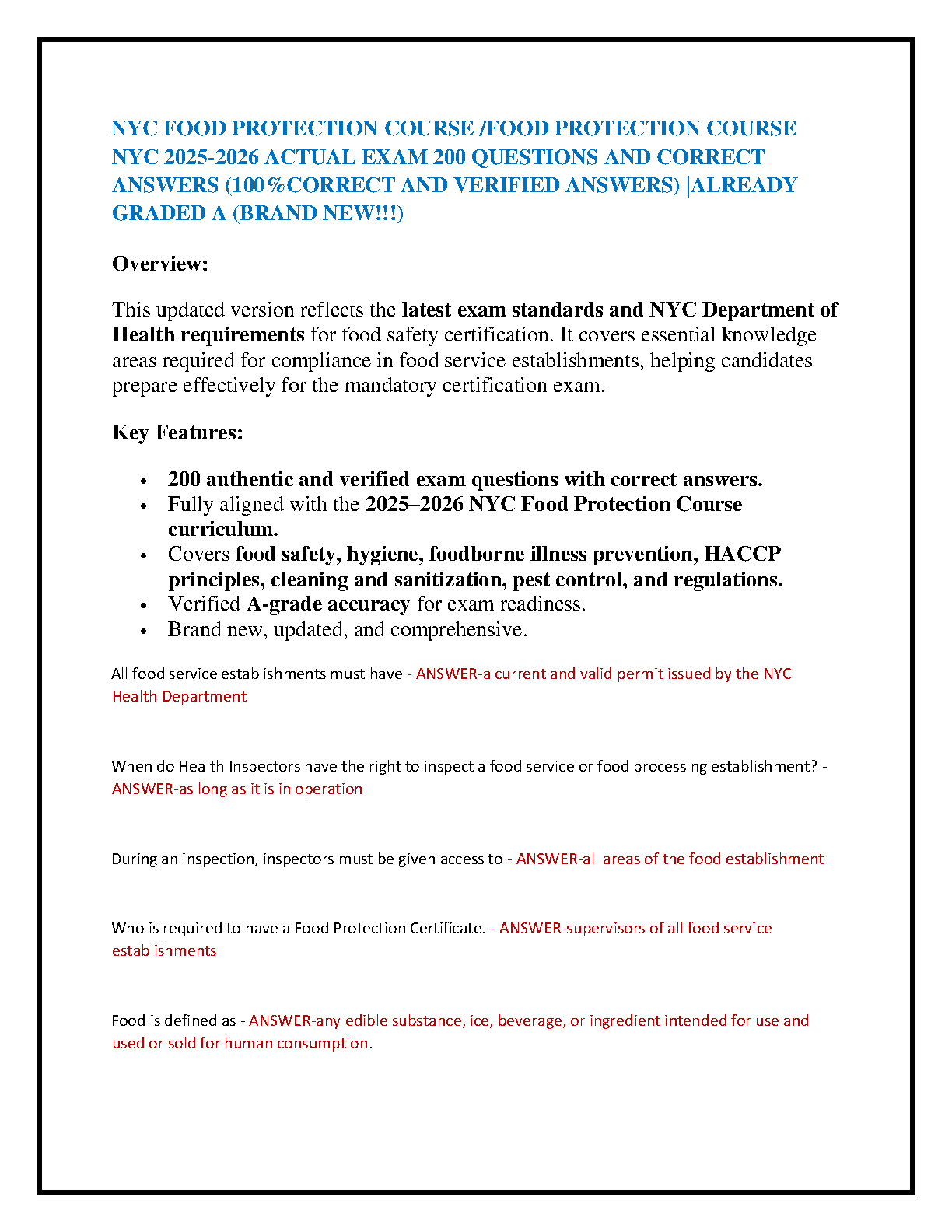 Ace your NYC Food Safety Certification on the first try with our comprehensive Test Bank for the 2025-2026 NYC Food Protection Course. This A-Grade study guide features 200 authentic exam questions complete with 100% correct and verified answers. Fully updated to align with the latest NYC Department of Health curriculum, this resource covers all essential topics, including food safety, hygiene, foodborne illness prevention, HACCP principles, cleaning, sanitation, and pest control. Prepare effectively, understand the key regulations, and pass your mandatory certification exam with confidence.