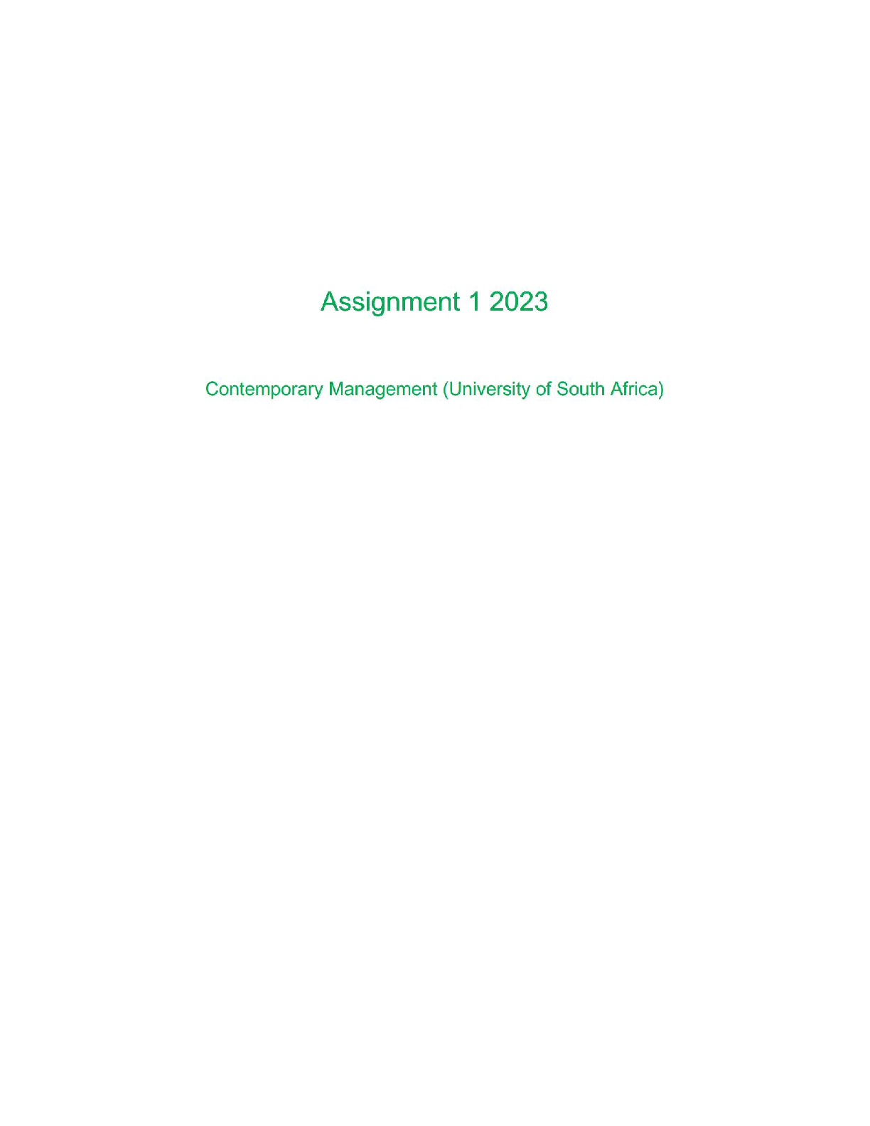 Unlock academic success in your Contemporary Management course at the University of South Africa (Unisa) with this comprehensive and detailed solution guide for Assignment 1 of 2023. Specifically tailored for modules like MNB1501 and MNB1601, this resource provides expertly crafted answers and thorough explanations to help you master key concepts. Use this invaluable study aid to prepare effectively for your exams, boost your understanding, and achieve the grade you deserve on your first try. It's the perfect tool to supplement your learning based on the renowned 'Contemporary Management' textbook by authors Gareth R. Jones and Jennifer M. George.