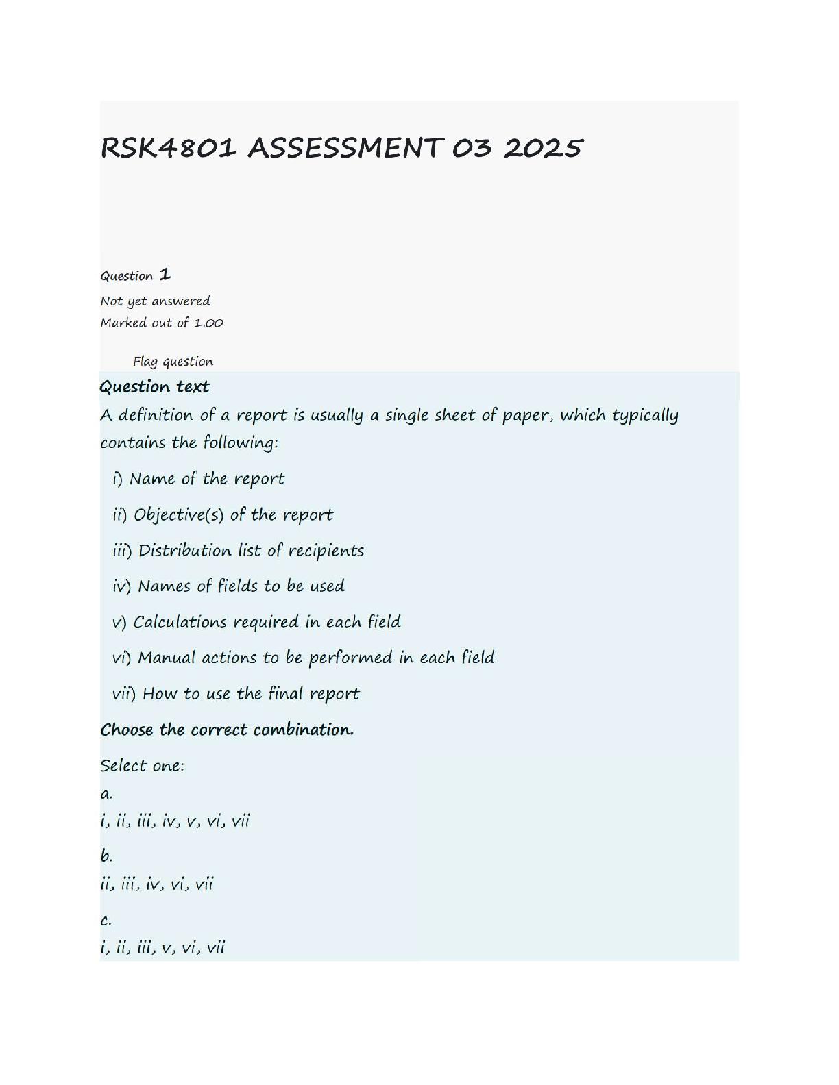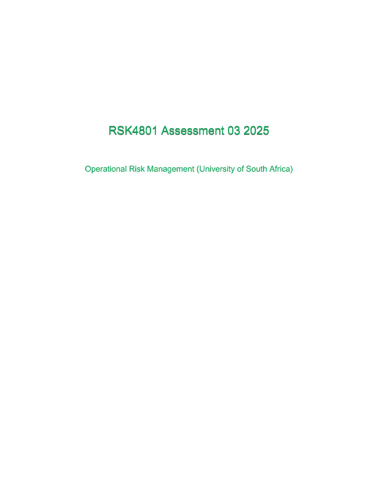 RSK4801 Assessment 3 2025: Operational Risk Management Exam Elaboration & Answers | Latest 2025/2026 UNISA Guide to Pass on Your First Attempt