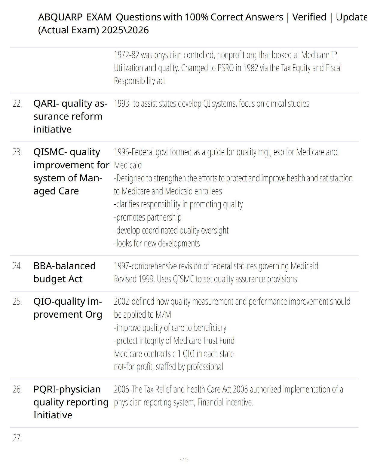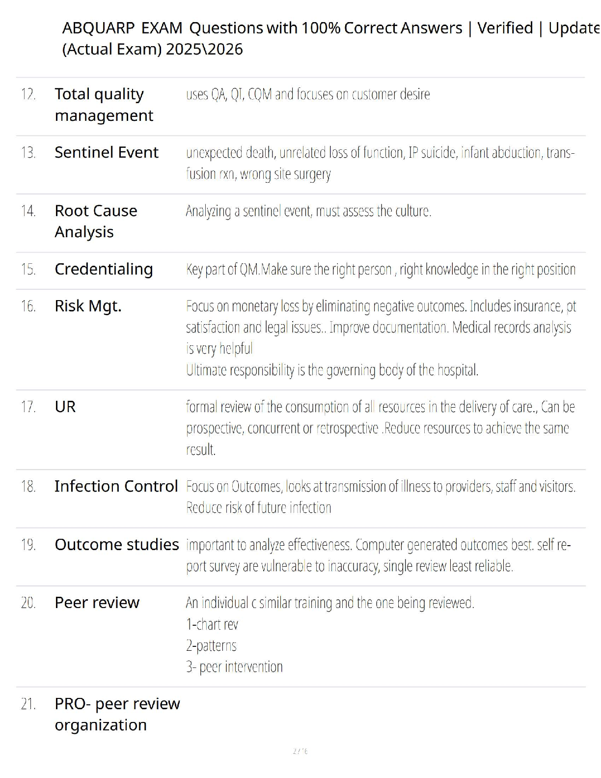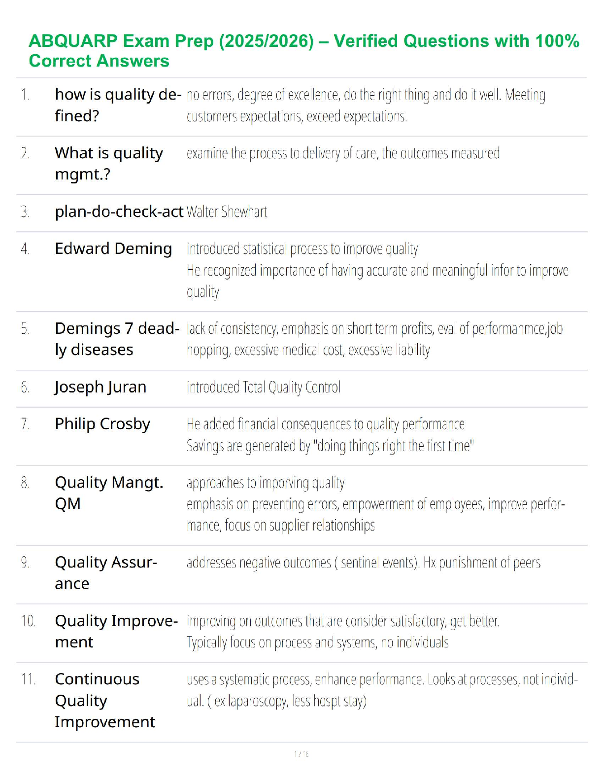 Get ready to ace your American Board of Quality Assurance and Utilization Review Physicians (ABQUARP) certification with our comprehensive exam prep guide for the 2025/2026 academic year. This study resource features a meticulously compiled list of verified questions, complete with 100% accurate answers. Dive deep into crucial topics like the principles of quality management, the contributions of key figures like Deming, Juran, and Crosby, and the nuances of Quality Assurance and Continuous Quality Improvement. This essential test bank is designed to streamline your study process, ensuring you master the material and pass the ABQUARP exam on your very first try.