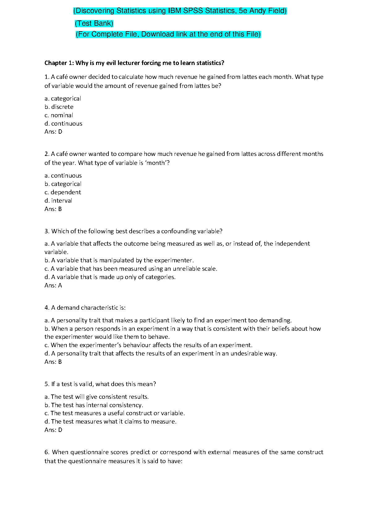 TEST BANK FOR Discovering Statistics using IBM SPSS Statistics, 5TH EDITION BY Andy Field. DOWNLOAD on www.hackedexams.com INSTANTLY.