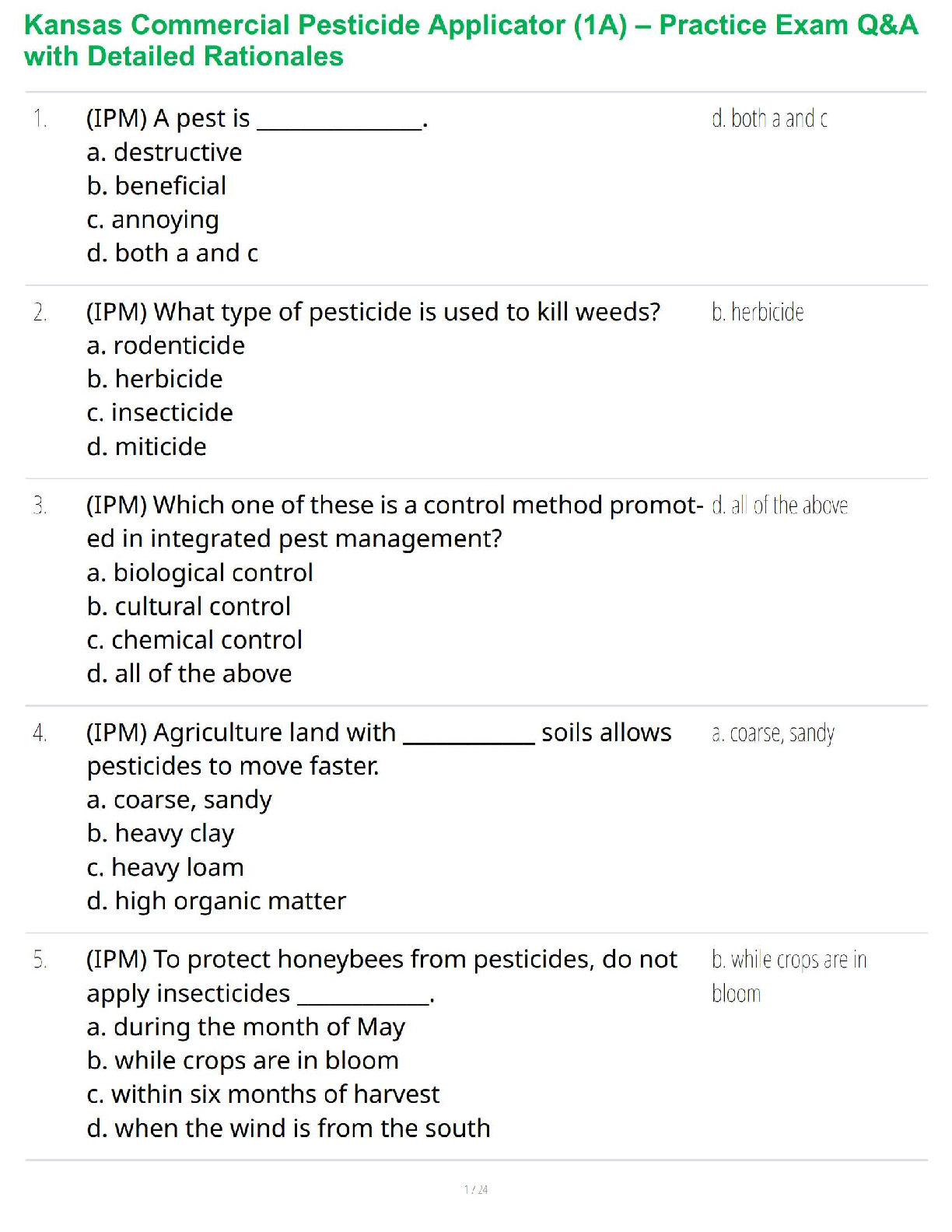 Master the material for your Kansas Commercial Pesticide Applicator (1A) certification with this complete test bank. This resource features an extensive collection of practice exam questions, each paired with a detailed rationale to explain the correct answer. Covering all essential topics from the official K-State Research and Extension training manual, including Integrated Pest Management (IPM), pesticide classification, application safety, and environmental protection, this guide is your key to success. Prepare effectively, build your confidence, and pass the Kansas 1A exam on your first attempt.