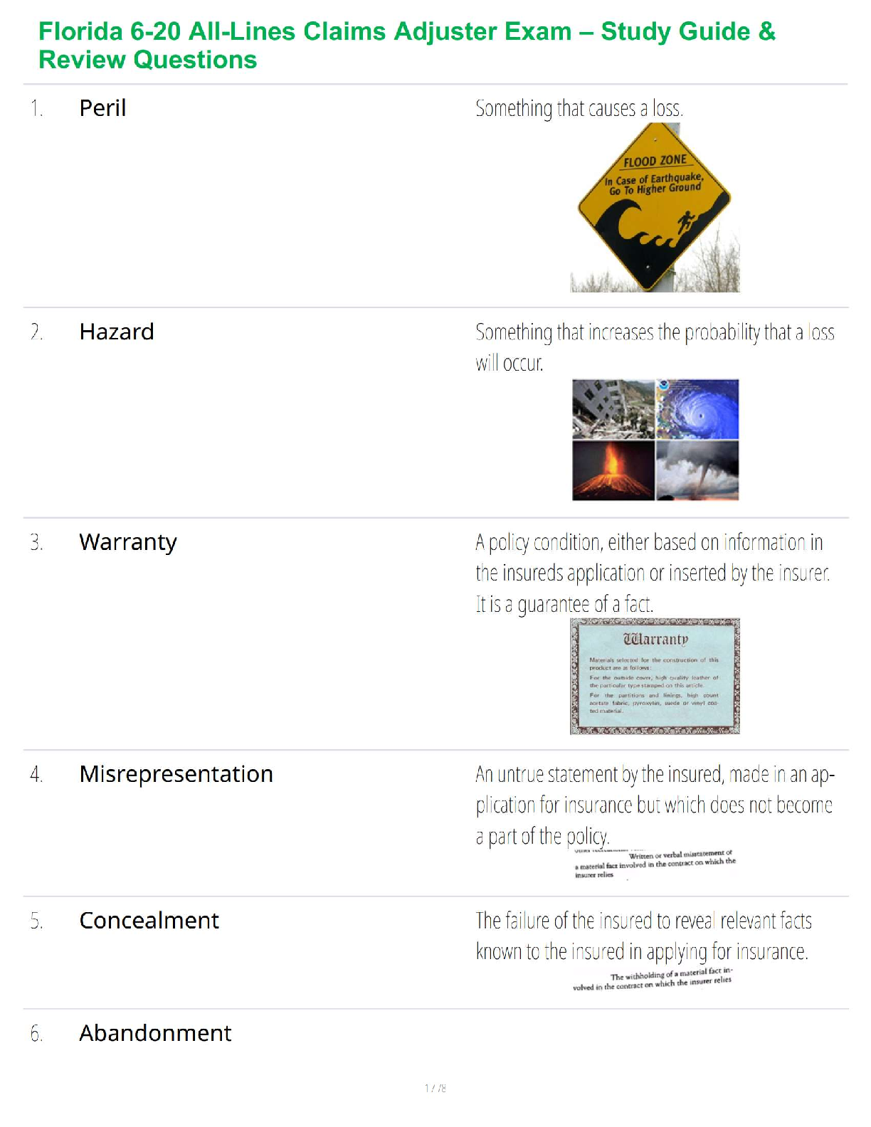 Ace your Florida 6-20 All-Lines Claims Adjuster Exam on the very first attempt! This comprehensive study guide, updated for the 2025/2026 testing cycle, provides a detailed breakdown of all essential topics and key definitions you need to know. Master concepts such as Peril, Hazard, Warranties, and Misrepresentation with our easy-to-understand explanations and review questions. Designed to help you avoid costly resits, this guide simplifies complex insurance principles, ensuring you are fully prepared and confident on exam day. Get the ultimate resource for a guaranteed pass and launch your career as a claims adjuster in Florida.