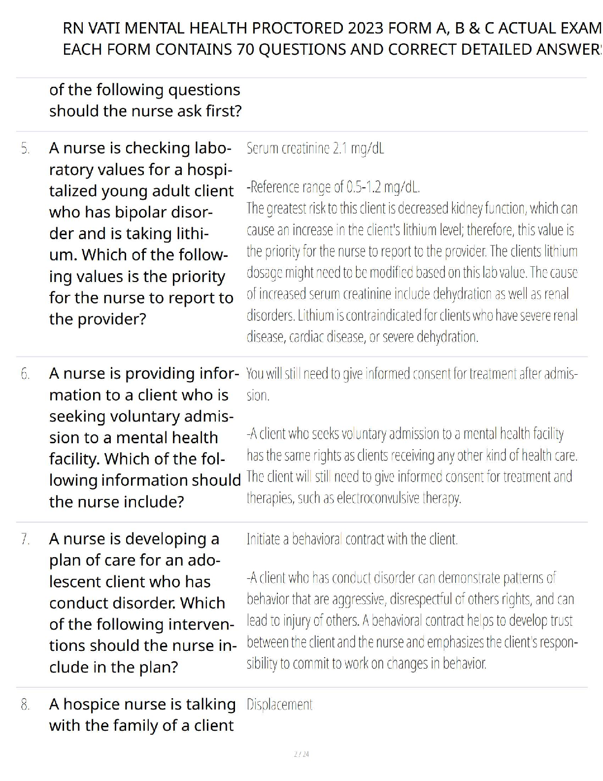 Ace your nursing exams with our complete test bank for the ATI RN VATI Mental Health Proctored Exam 2023. This indispensable study guide provides 70 expertly verified questions and detailed answers, covering all content from Forms A, B, and C. Designed for nursing students aiming for success, this resource will help you master key mental health nursing concepts, understand the rationale behind correct answers, and build the confidence needed to excel on the proctored exam. Get immediate access to this comprehensive Q&A bank and take the most effective step towards passing your VATI assessment with flying colors.