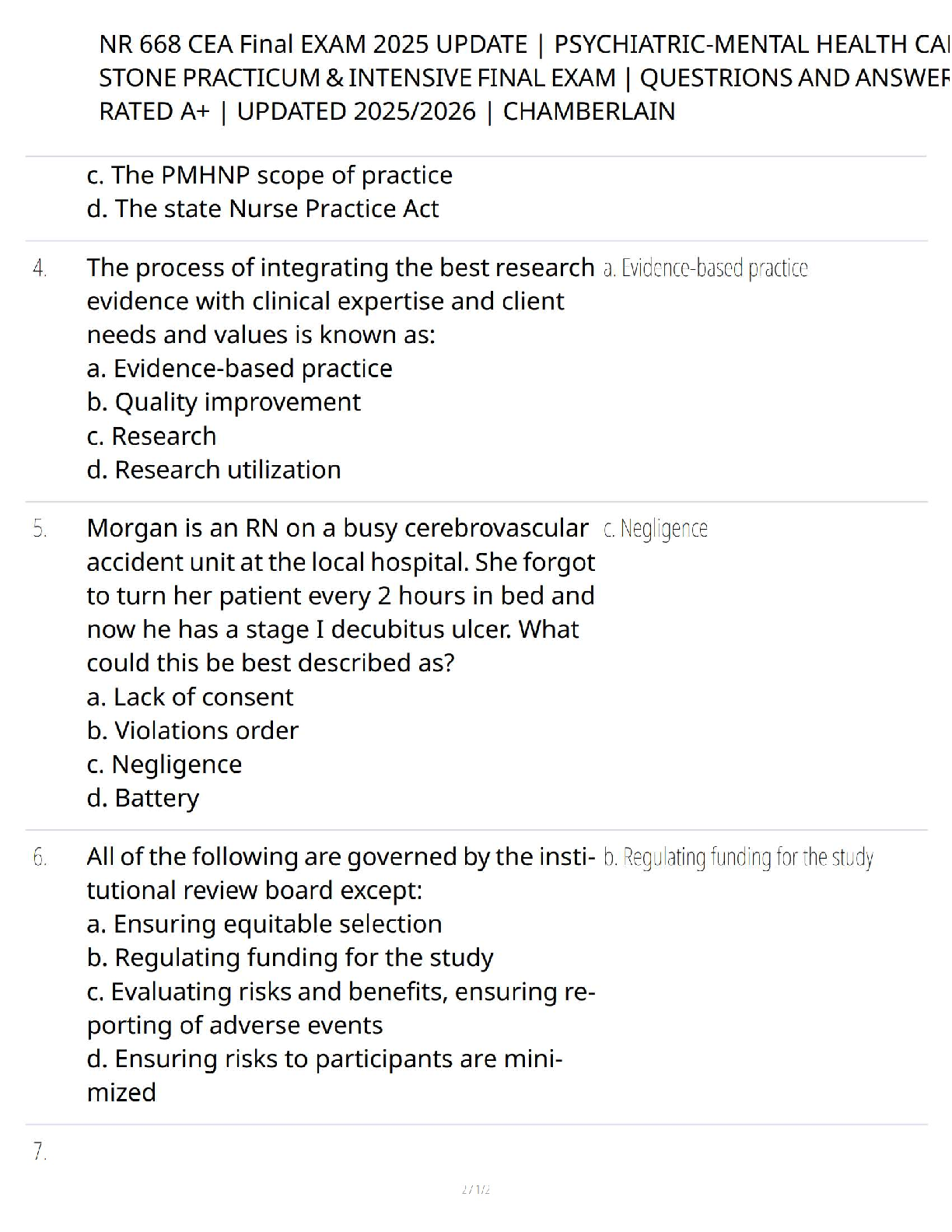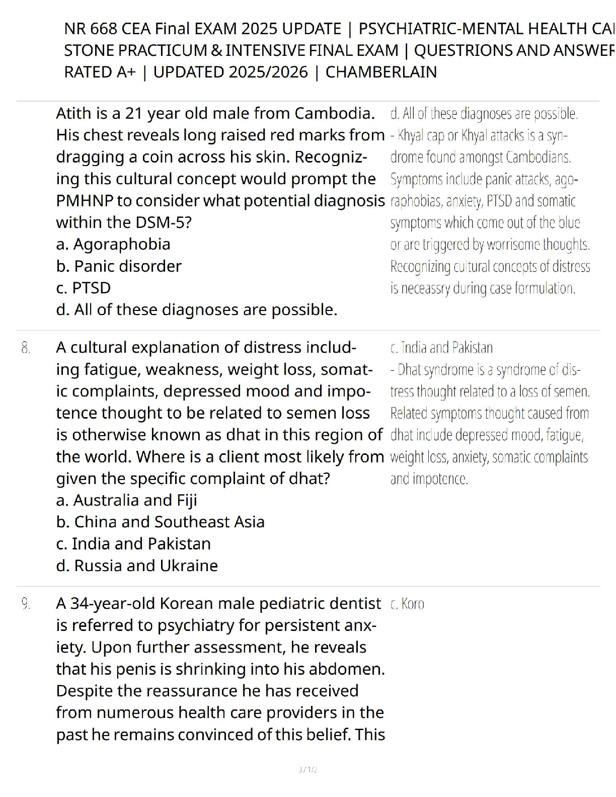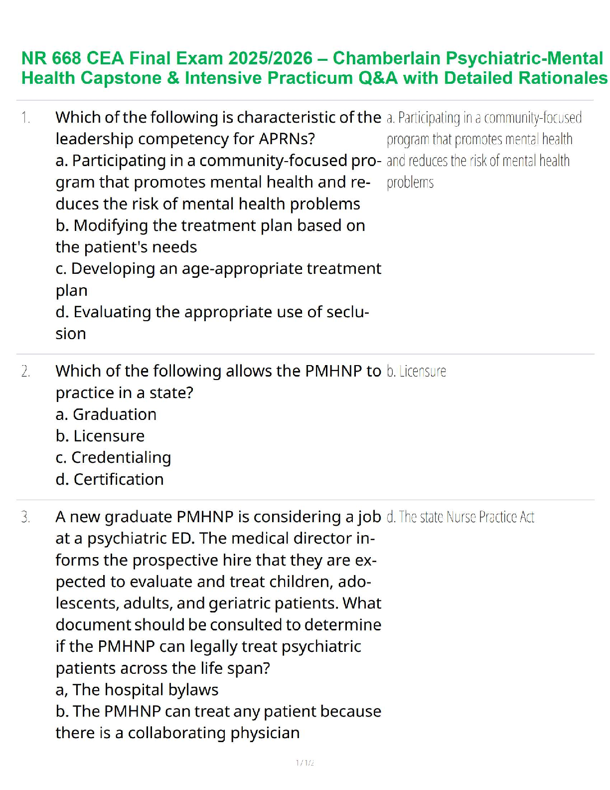 Prepare to excel in your Chamberlain University NR 668 course with this ultimate final exam test bank for the 2025/2026 academic year. This comprehensive resource covers the Psychiatric-Mental Health Capstone & Intensive Practicum, providing a full set of exam-style questions and answers (Q&A). Each answer is accompanied by a detailed rationale, designed to deepen your understanding of key concepts and ensure you are fully prepared. Master the material, boost your confidence, and pass your NR 668 final exam on your first attempt with this essential study guide.