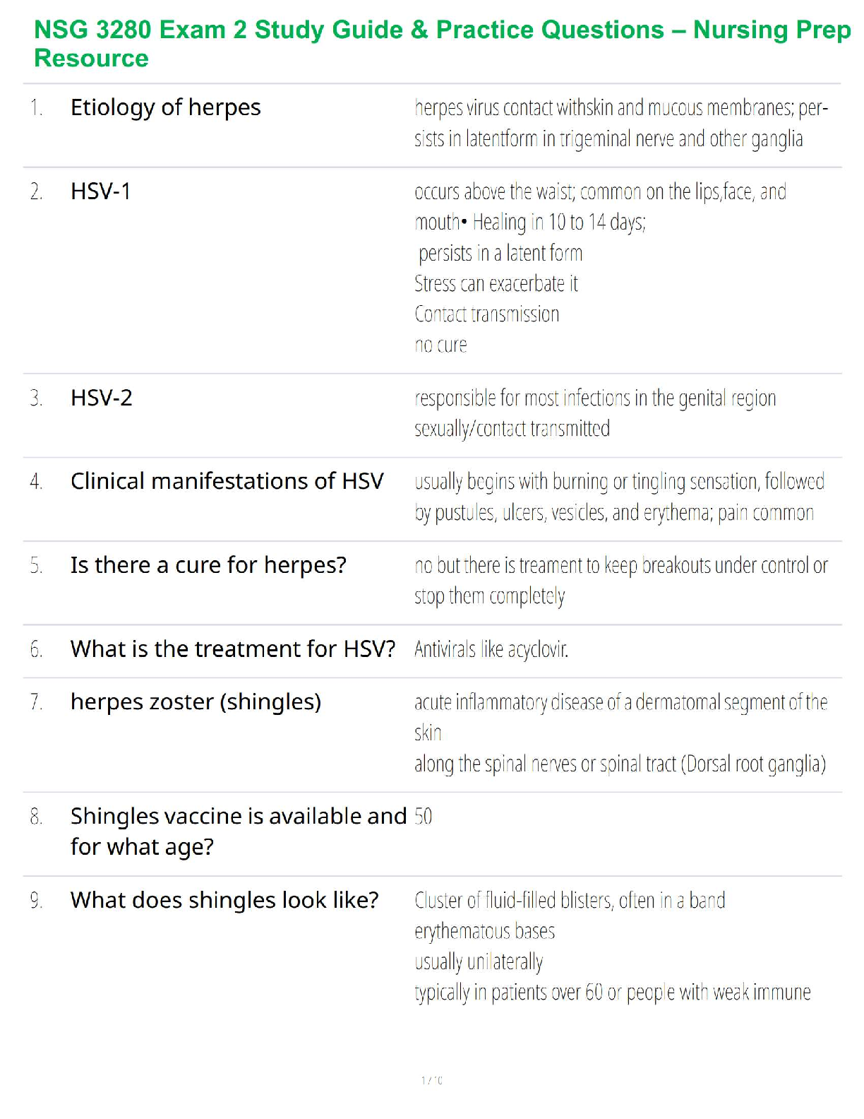 Unlock success in your NSG 3280 Exam 2 with this expertly crafted study guide for the 2025/2026 academic year. This comprehensive resource simplifies complex nursing topics, featuring in-depth practice questions and answers on herpes viruses (HSV-1, HSV-2), shingles, clinical manifestations, and treatments. Designed for efficient learning, this guide is your key to acing the exam and avoiding resits.